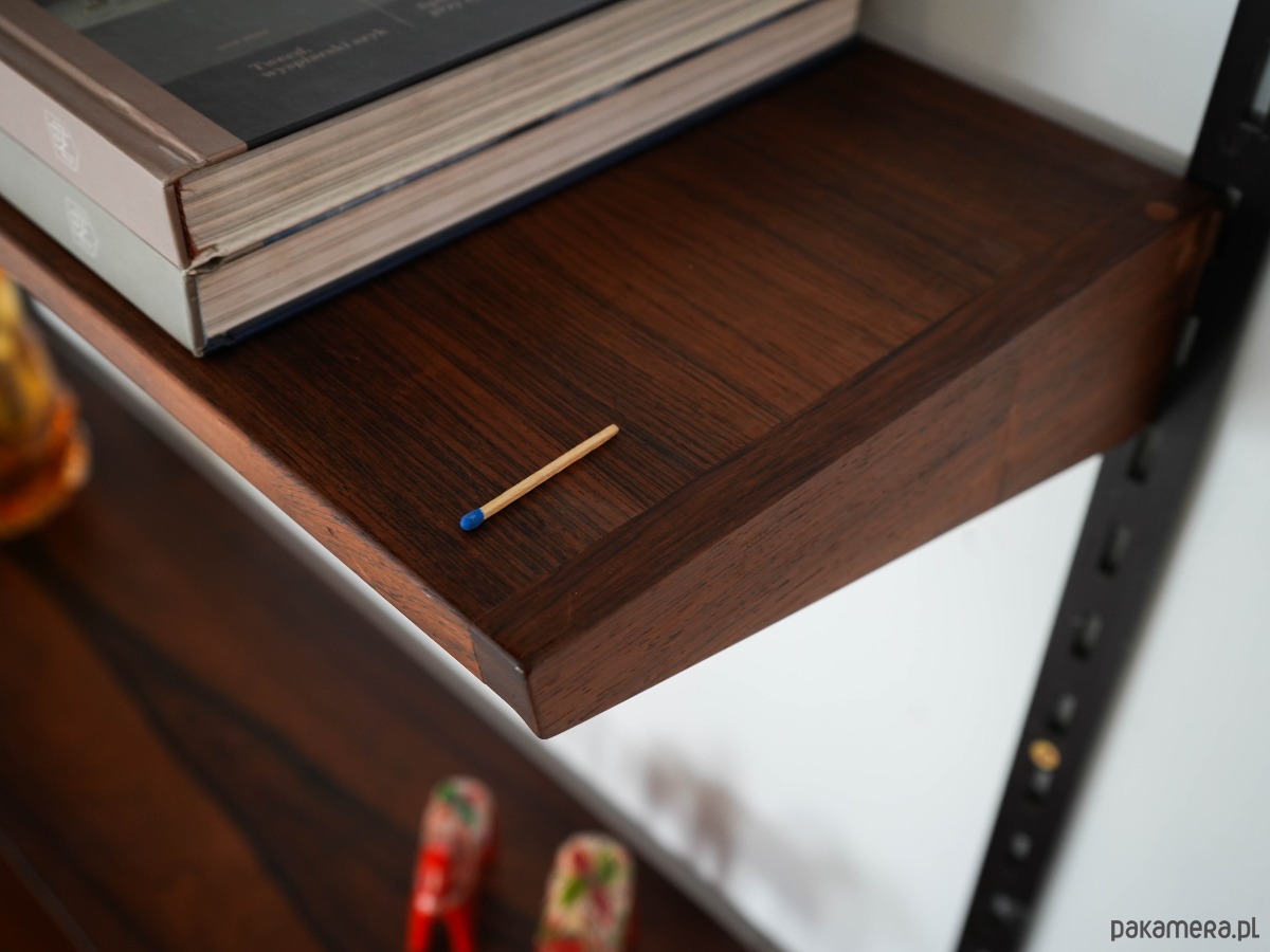 Konstrukcja pokryta jest fornirem palisandrowym. Powierzchnia po odświeżeniu. Mebel składa się z siedmiu praktycznych półek oraz pojemnej komody. Regał jest idealnym rozwiązaniem na zbiór książek do zagospodarowania w małej przestrzeni mieszkalnej. Dodatkowo świetnie spełni funkcję regału na przedmioty kolekcjonerskie. Wszystkie elementy posiadają możliwość regulacji wysokości.