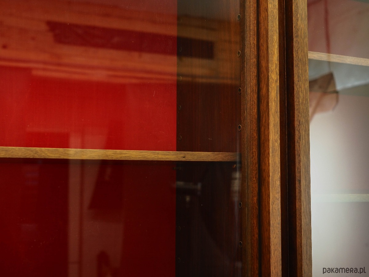 Konstrukcja pokryta została fornirem palisandrowym. Uchwyty pokryte mosiądzem. Powierzchnia po odświeżeniu. Mebel składa się z jedenastu regulowanych półek, dwunastu praktycznych szuflad oraz trzech pojemnych szafek. Dodatkowo wnętrze szafek zostało wypełnione następnymi dwiema półkami. Regał jest idealnym rozwiązaniem na zbiór książek do zagospodarowania w małej przestrzeni mieszkalnej. Świetnie spełni funkcję regału na przedmioty kolekcjonerskie. Brak klucza w zestawie.