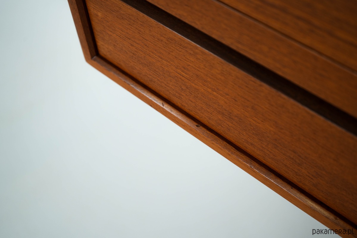 Konstrukcja pokryta została fornirem tekowym. Powierzchnia po odświeżeniu. Mebel składa się z sześciu praktycznych półek, szafki oraz czterech pojemnych szuflad. Mebel jest idealnym rozwiązaniem na zbiór książek do zagospodarowania w małej przestrzeni mieszkalnej. Dodatkowo świetnie spełni funkcję regału na przedmioty kolekcjonerskie. Wszystkie elementy posiadają możliwość regulacji wysokości.
