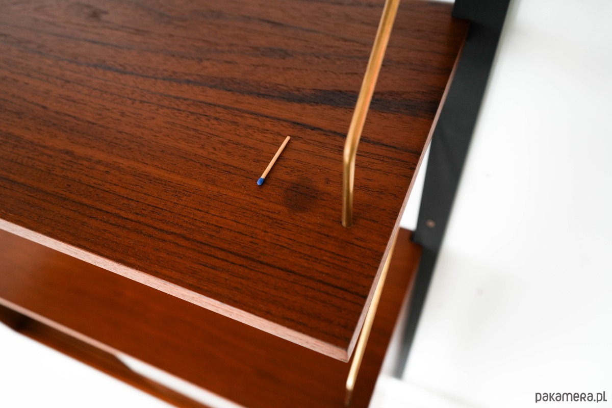Konstrukcja pokryta została fornirem tekowym. Powierzchnia po odświeżeniu. Mebel składa się z trzech praktycznych półek oraz pojemnej szafki z przesuwnymi szklanymi drzwiczkami. Mebel jest idealnym rozwiązaniem na zbiór książek do zagospodarowania w małej przestrzeni mieszkalnej. Dodatkowo świetnie spełni funkcję regału na przedmioty kolekcjonerskie. Wszystkie elementy posiadają możliwość regulacji wysokości.