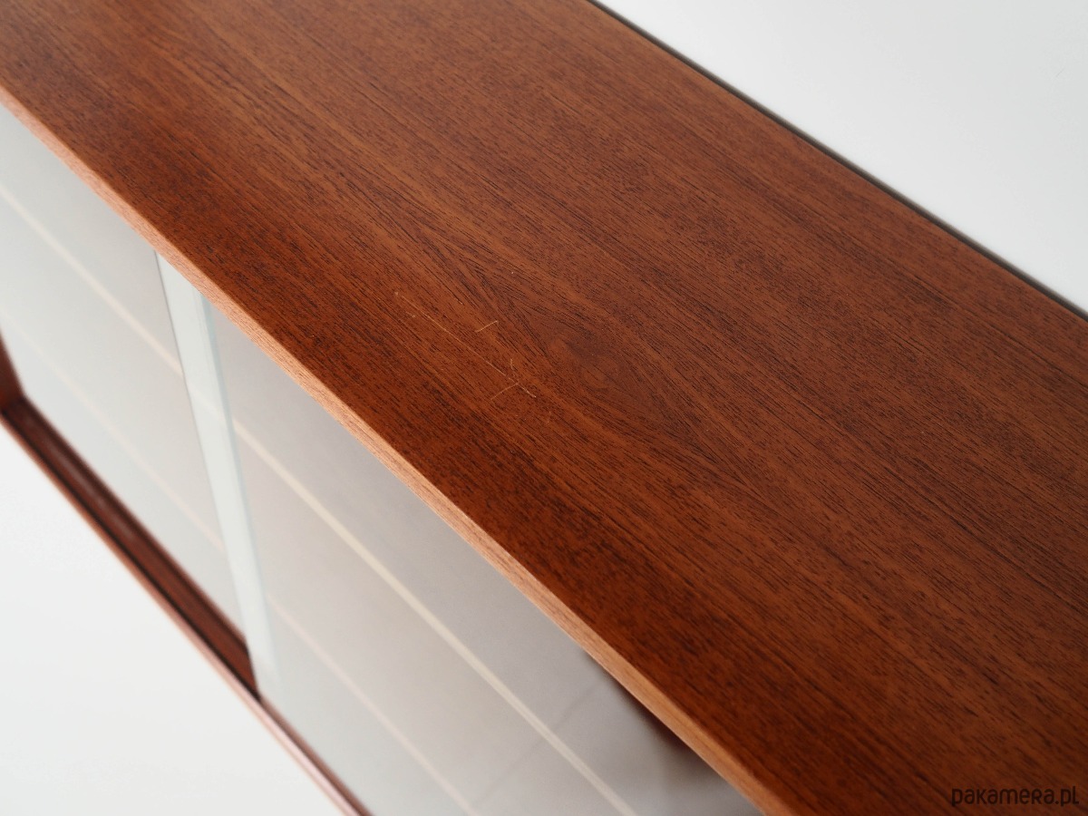 Konstrukcja pokryta została fornirem tekowym. Powierzchnia po odświeżeniu. Mebel składa się z trzech praktycznych półek oraz pojemnej szafki z przesuwnymi szklanymi drzwiczkami. Wewnątrz szafki umieszczono dwie dodatkowe półeczki. Mebel jest idealnym rozwiązaniem na zbiór książek do zagospodarowania w małej przestrzeni mieszkalnej. Dodatkowo świetnie spełni funkcję regału na przedmioty kolekcjonerskie. Wszystkie elementy posiadają możliwość regulacji wysokości.