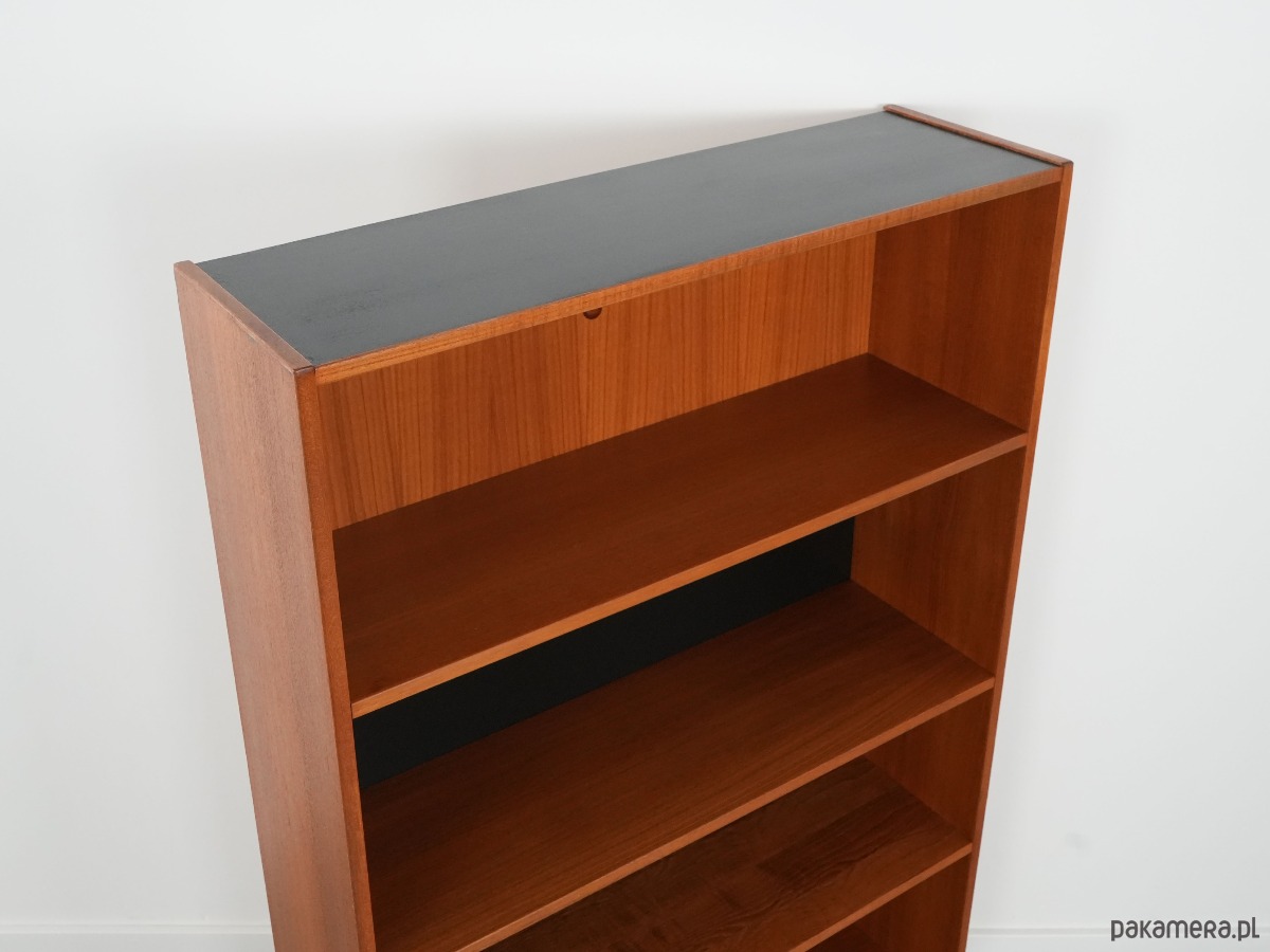 Konstrukcja pokryta jest fornirem tekowym. Nogi wykonane zostały z litego drewna wybarwionego na kolor czarny. Powierzchnia po odświeżeniu. Wewnątrz przestrzeń została wypełniona trzema praktycznymi półkami. Dwie dolne półki posiadają możliwość regulacji wysokości. Regał jest idealnym rozwiązaniem na zbiór książek do zagospodarowania w małej przestrzeni mieszkalnej. Dodatkowo świetnie spełni funkcję regału na przedmioty kolekcjonerskie.