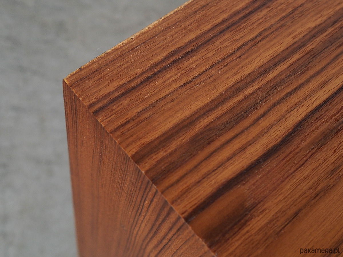 Stan: Powierzchnia mebla po odświeżeniu. Widoczne są drobne zarysowania, obicia oraz wypełnione ubytki forniru. Większe ślady użytkowania zawsze prezentowane są na zdjęciach. Produkt jest gotowy do użytku.