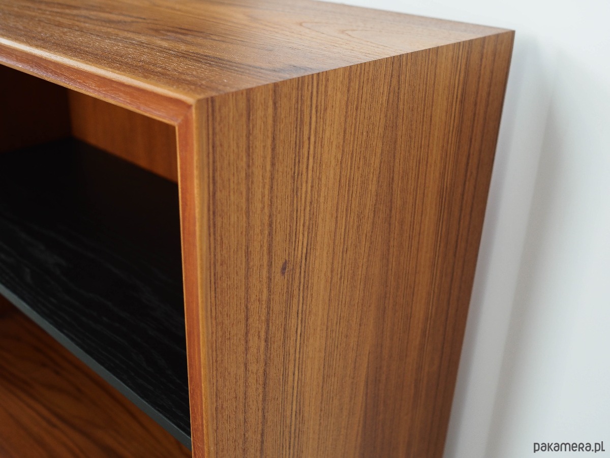 Konstrukcja pokryta jest fornirem tekowym. Nogi wykonane z litego drewna wybarwionego na kolor czarny. Powierzchnia po odświeżeniu. Wewnątrz przestrzeń została wypełniona dwiema praktycznymi półkami z możliwością regulacją wysokości. Regał jest idealnym rozwiązaniem na zbiór książek lub przedmiotów kolekcjonerskich do zagospodarowania w małej przestrzeni mieszkalnej.