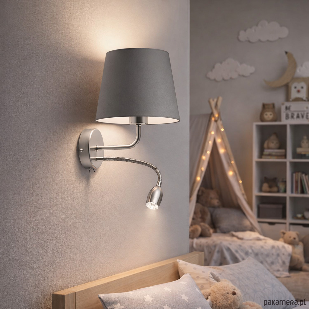 Kinkiet IMPERIA będzie idealną dekoracją do pokoju Twojego dziecka. Oświetlenie nie tylko potowarzyszy Twojemu maluchowi podczas wieczornej zabawy ale także w czasie zasypiania. IMPERIA to niezwykle funkcjonalny model. Oświetlenie poza miejscem na klasyczną żarówkę posiada ruchomy panel LED, który można nakierować w dowolnym kierunku. Lampę wykonano używając najwyższej jakości komponentów. Stelaż lampy stanowią elementy metalowe zaś jej abażur wyprodukowany został z holenderskiej tkaniny tekstylnej podklejonej na folii PVC.