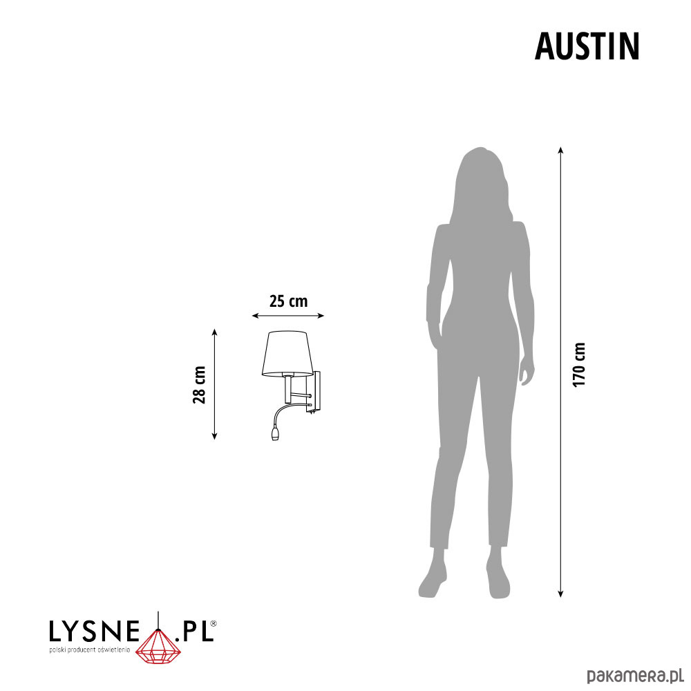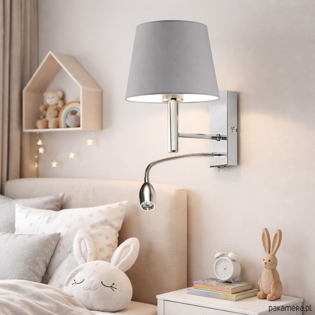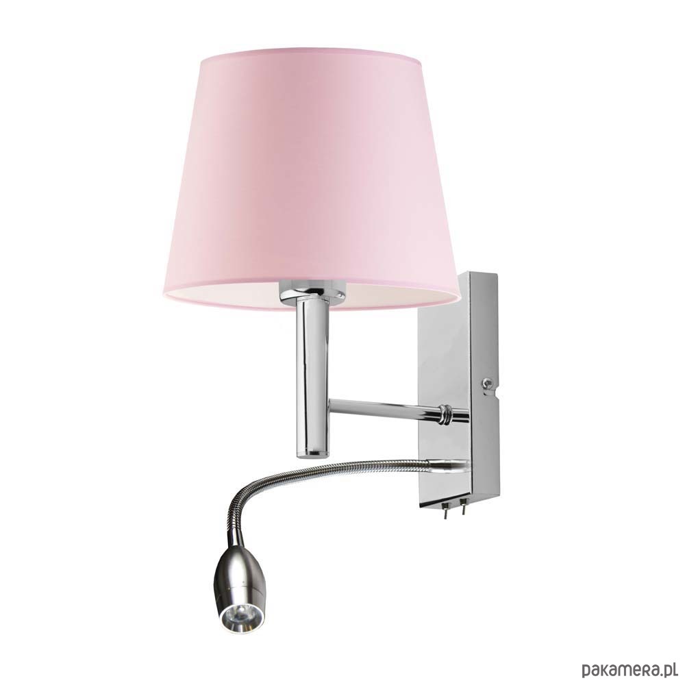 Kinkiet AUSTIN to niezwykłe połączenie funkcjonalności z rolą dekoracyjną. Stożkowa postać abażuru w połączeniu z pastelowymi barwami, świetnie współgra z dziecięcym wystrojem wnętrza. Należy także podkreślić, że lampa poza standardowym źródłem światła, wyposażona jest w panel LED, który dodatkowo można ustawić w wybranym przez siebie kierunku. Całokształt kinkietu idealnie harmonizować będzie ze znajdującymi się we wnętrzu akcesoriami i mebelkami dziecięcymi.