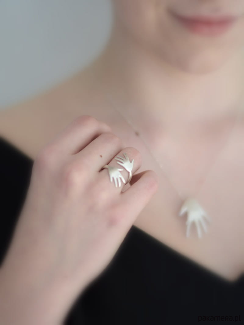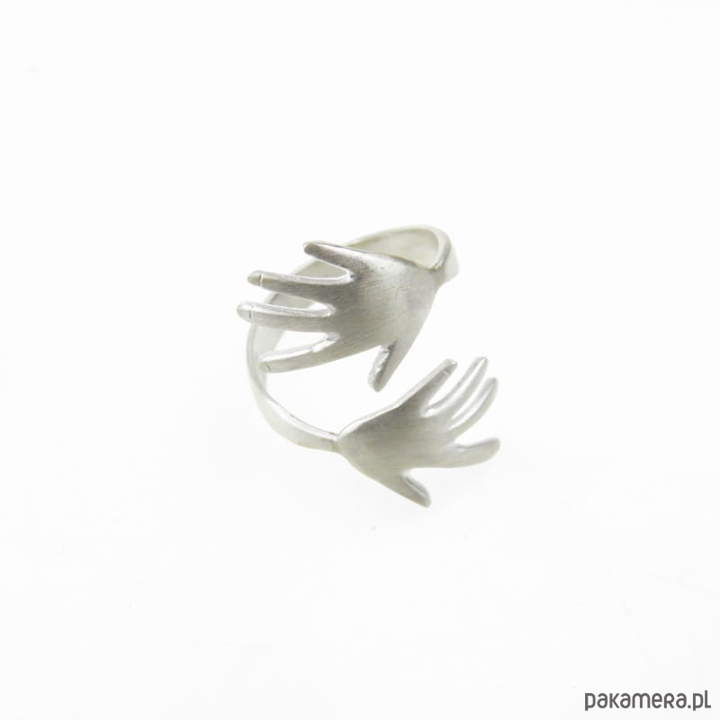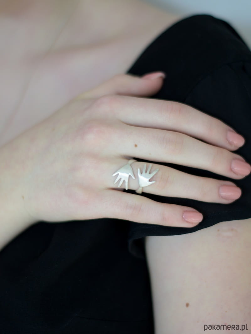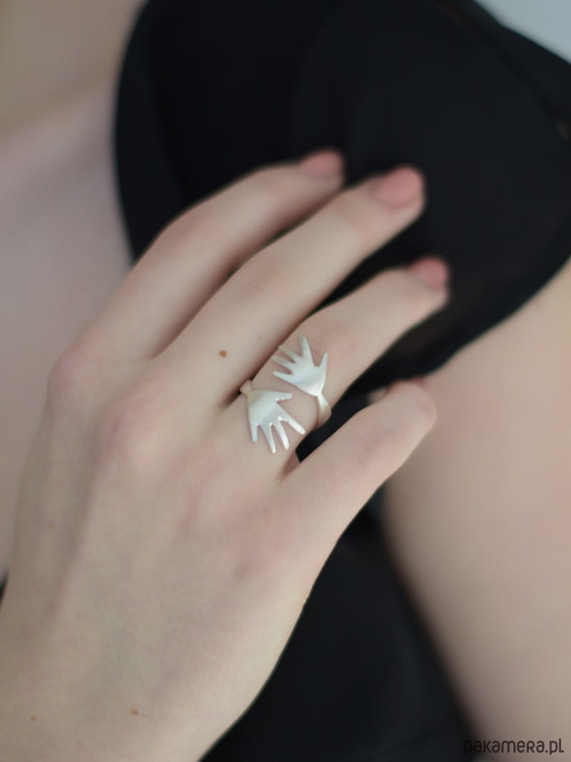 Pierścionek wykonany w całości ze srebra próby 925 na regulowanej obrączce zakończonej dłońmi, które chwytają Twój palec.
