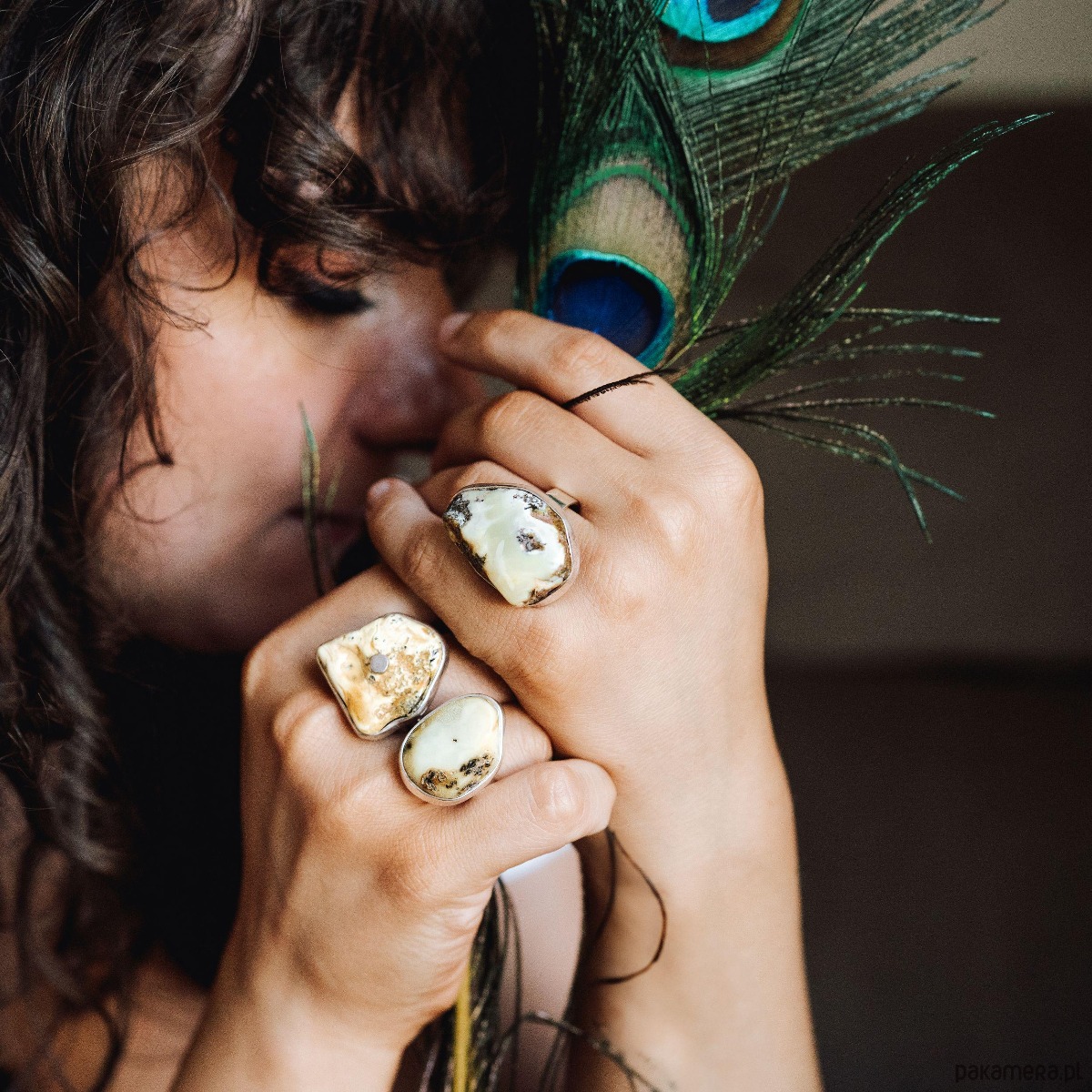 Regulowany pierścionek z naturalnym bursztynem bałtyckim — elegancki, ręcznie wykonany element biżuterii, łączący surowe piękno kamienia z klasyczną oprawą ze srebra próby 925. Centralnym punktem jest nieoszlifowany, organicznie ukształtowany bursztyn o kremowo-miodowych odcieniach przechodzących w cieplejsze, ziemiste tony. Nieregularny kształt kamienia podkreśla jego naturalne pochodzenie i czyni każdy egzemplarz niepowtarzalnym.