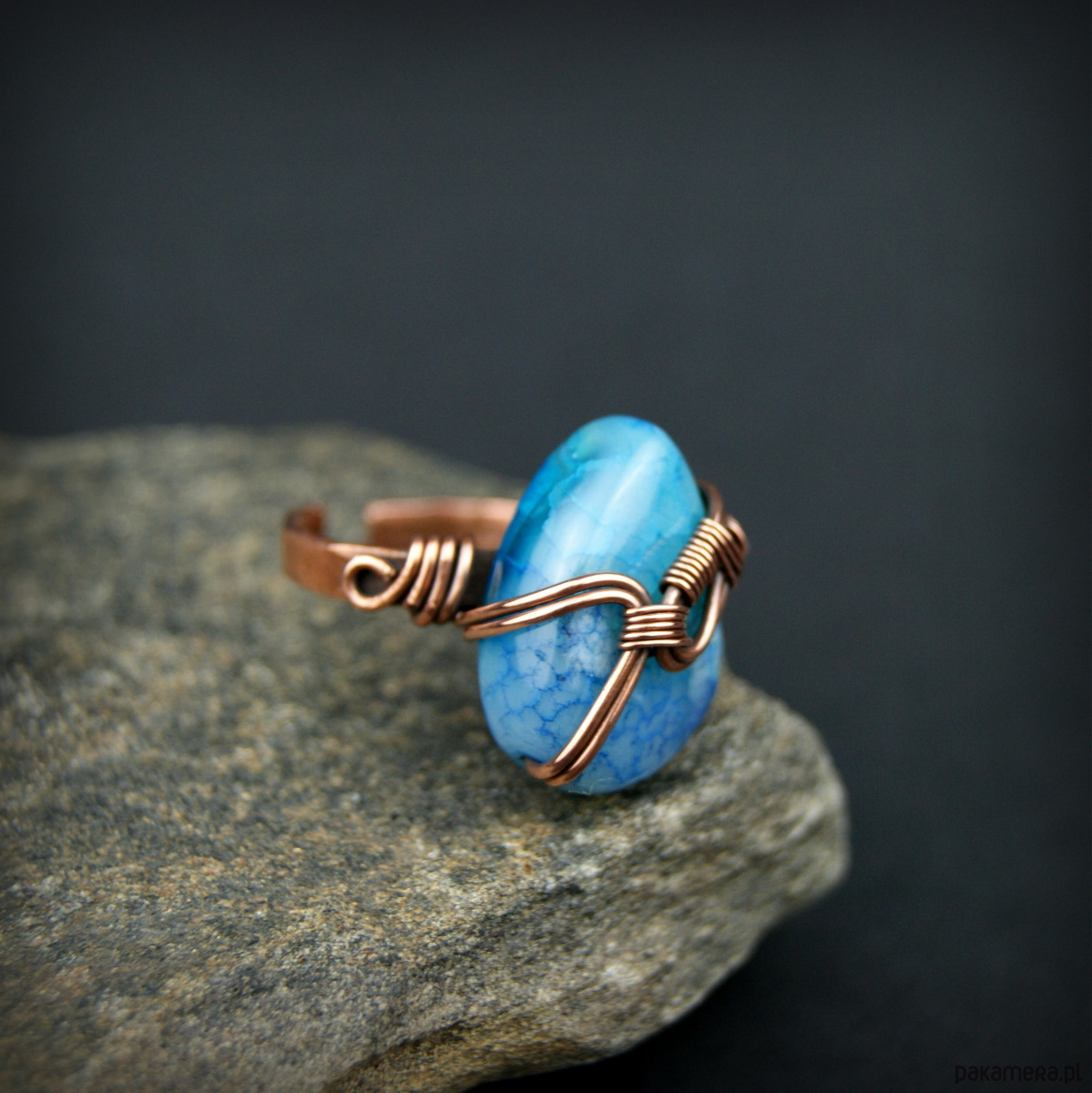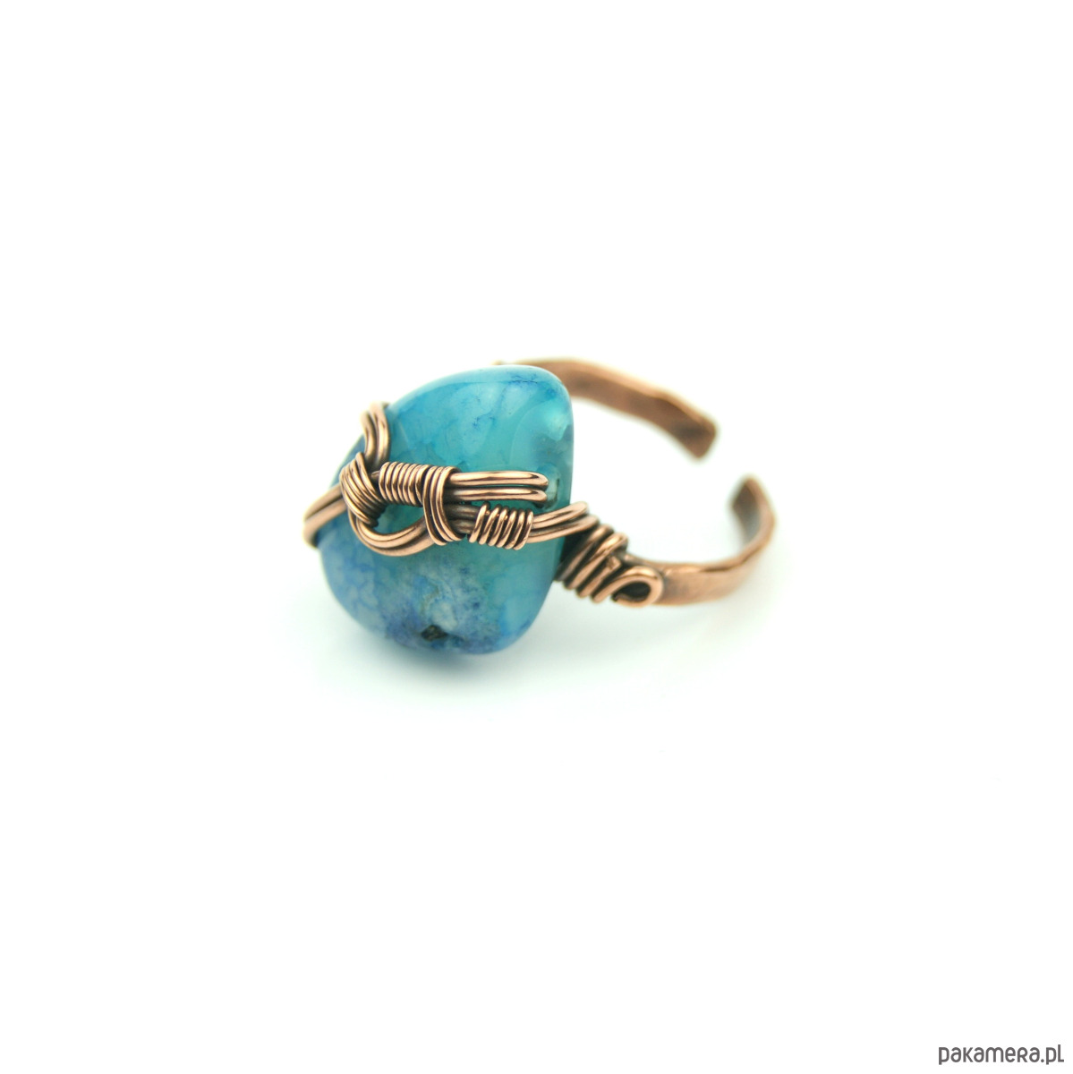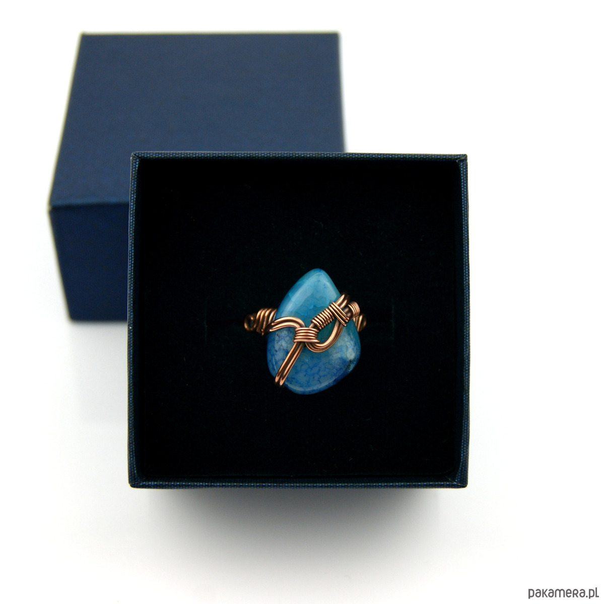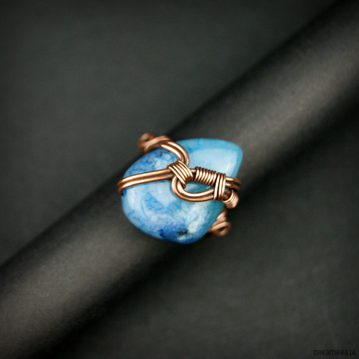 Pierścionek wykonany w pracochłonnej technice wire wrappingu. Centralnym punktem jest tu duży niebieski agat, który został misternie opleciony miedzią. Pierścionek w uniwersalnym rozmiarze, możliwość regulacji.