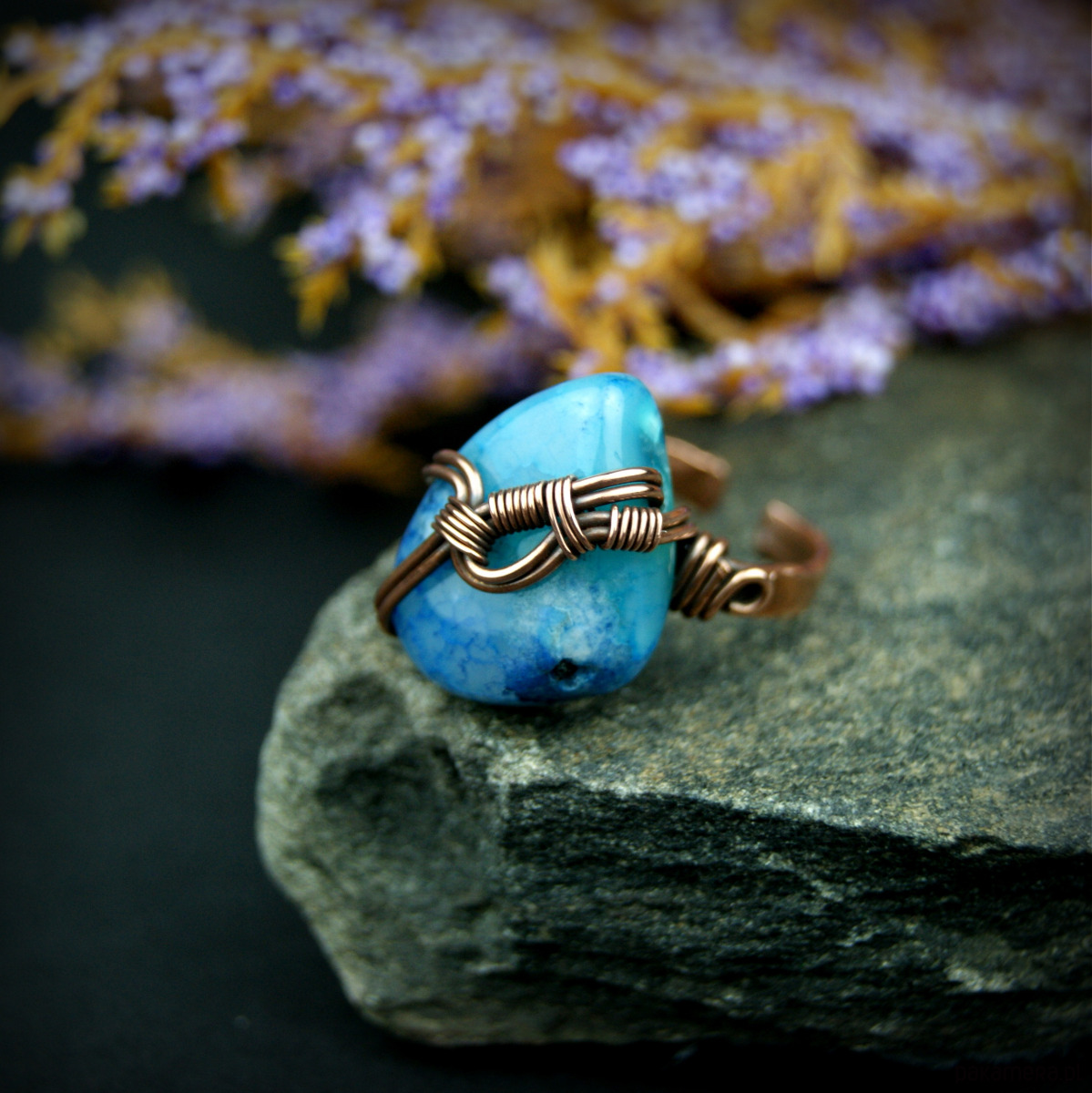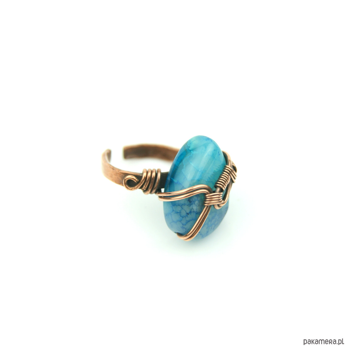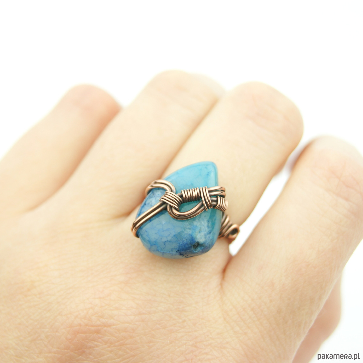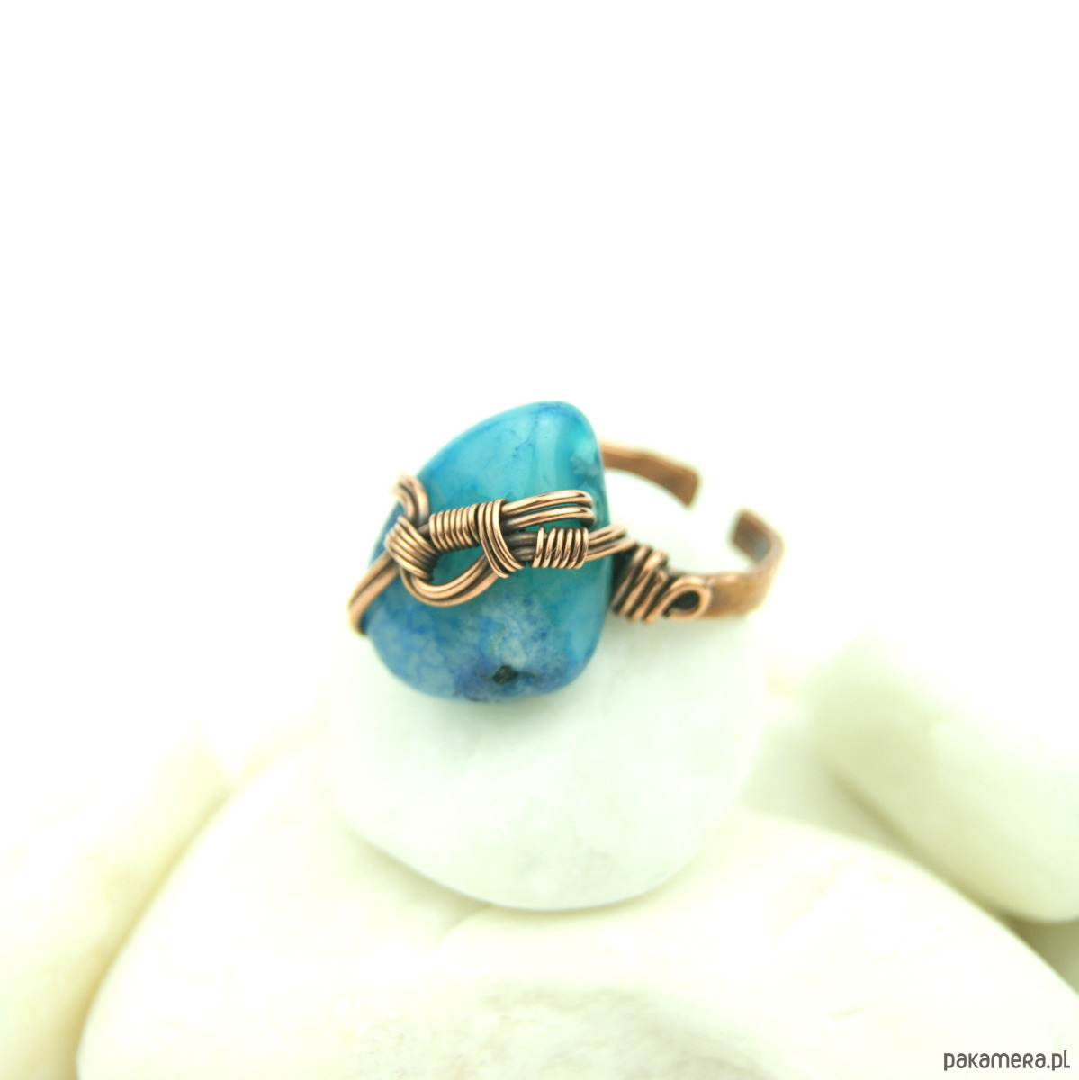 Pierścionek wykonany w pracochłonnej technice wire wrappingu. Centralnym punktem jest tu duży niebieski agat, który został misternie opleciony miedzią. Pierścionek w uniwersalnym rozmiarze, możliwość regulacji.