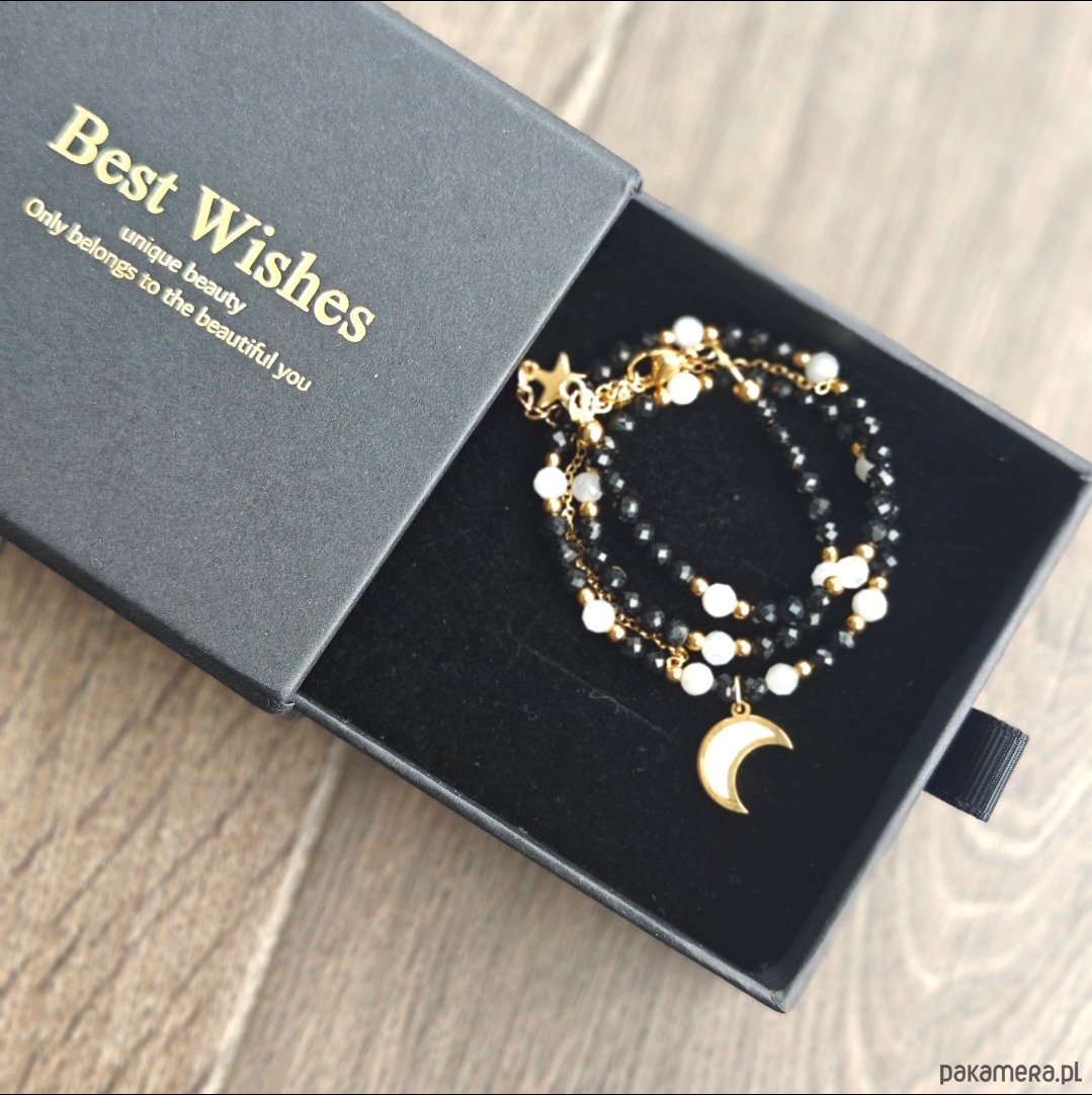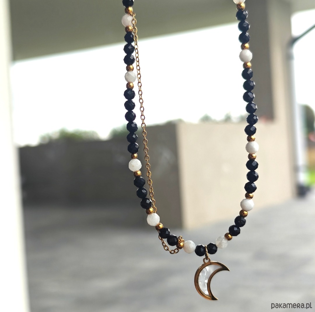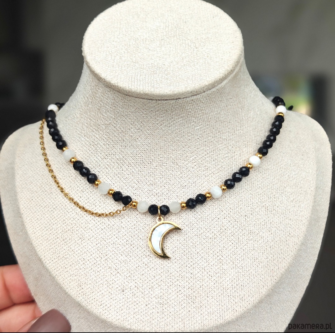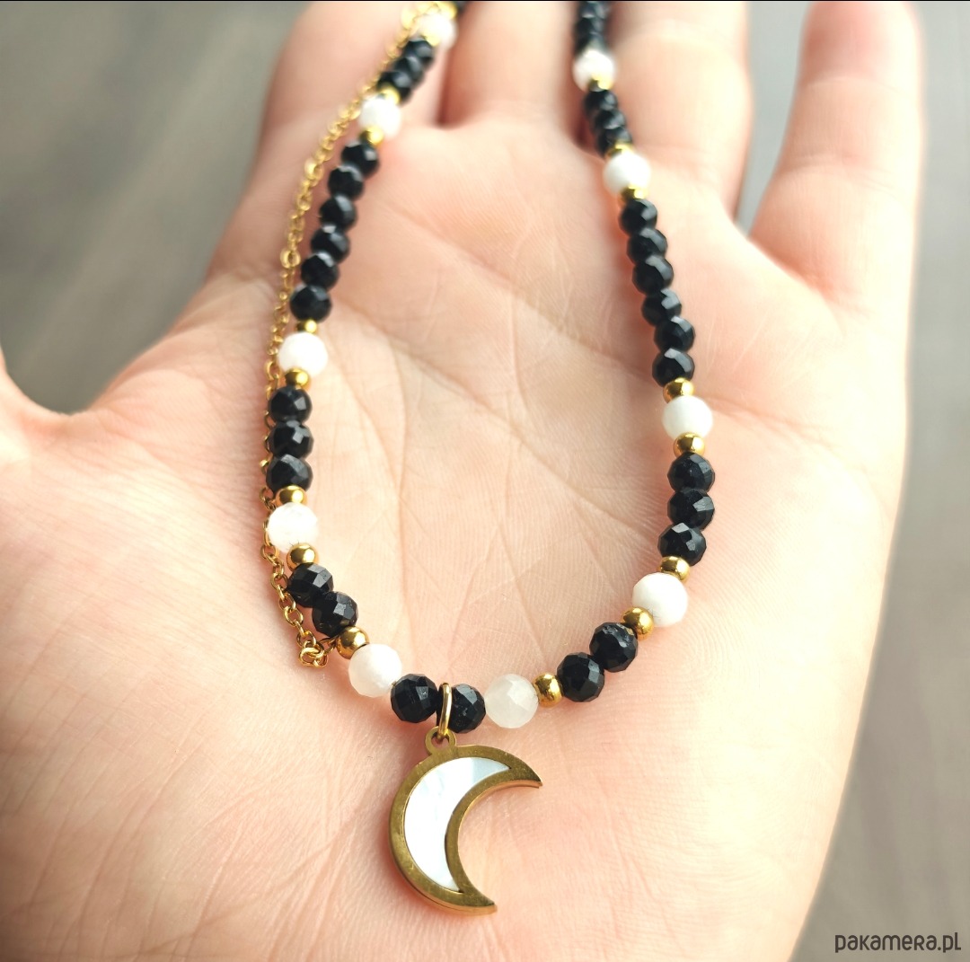 Regulowany naszyjnik wykonany z czarnego turmalinu i kamienia księżycowego, o długości 38 cm z możliwością przedłużenia o dodatkowe 6 cm łańcuszka. Centralnym elementem jest zawieszka w kształcie księżyca wykonana z masy perłowej, a całość uzupełnia efektowny boczny łańcuszek. Elementy ze stali chirurgicznej oraz drobne akcenty ze srebra pozłacanego dodają biżuterii trwałości i elegancji. Naszyjnik pakowany jest w eleganckie pudełko, dzięki czemu świetnie sprawdzi się również jako prezent. 🎁