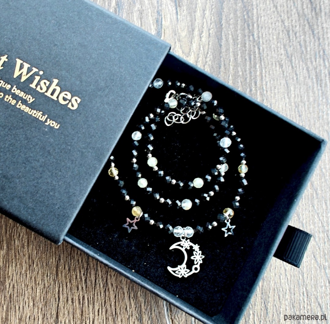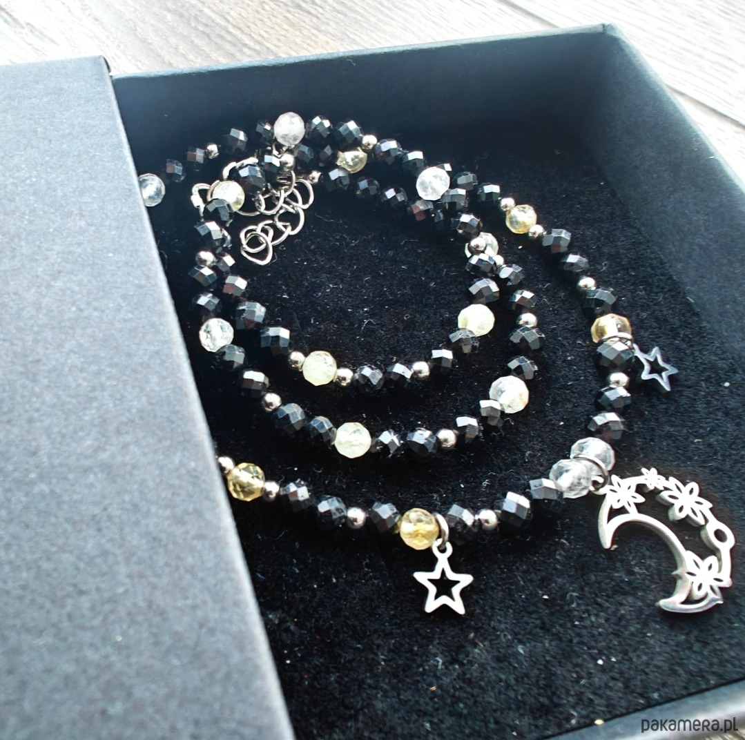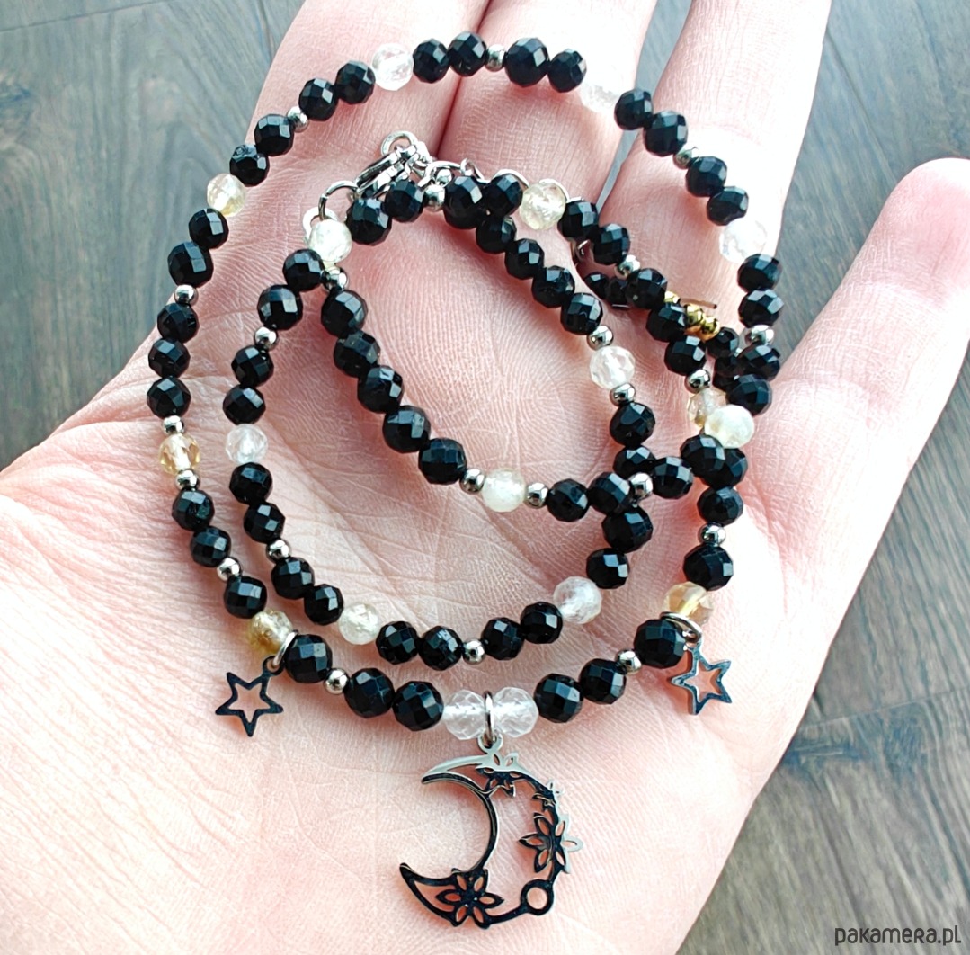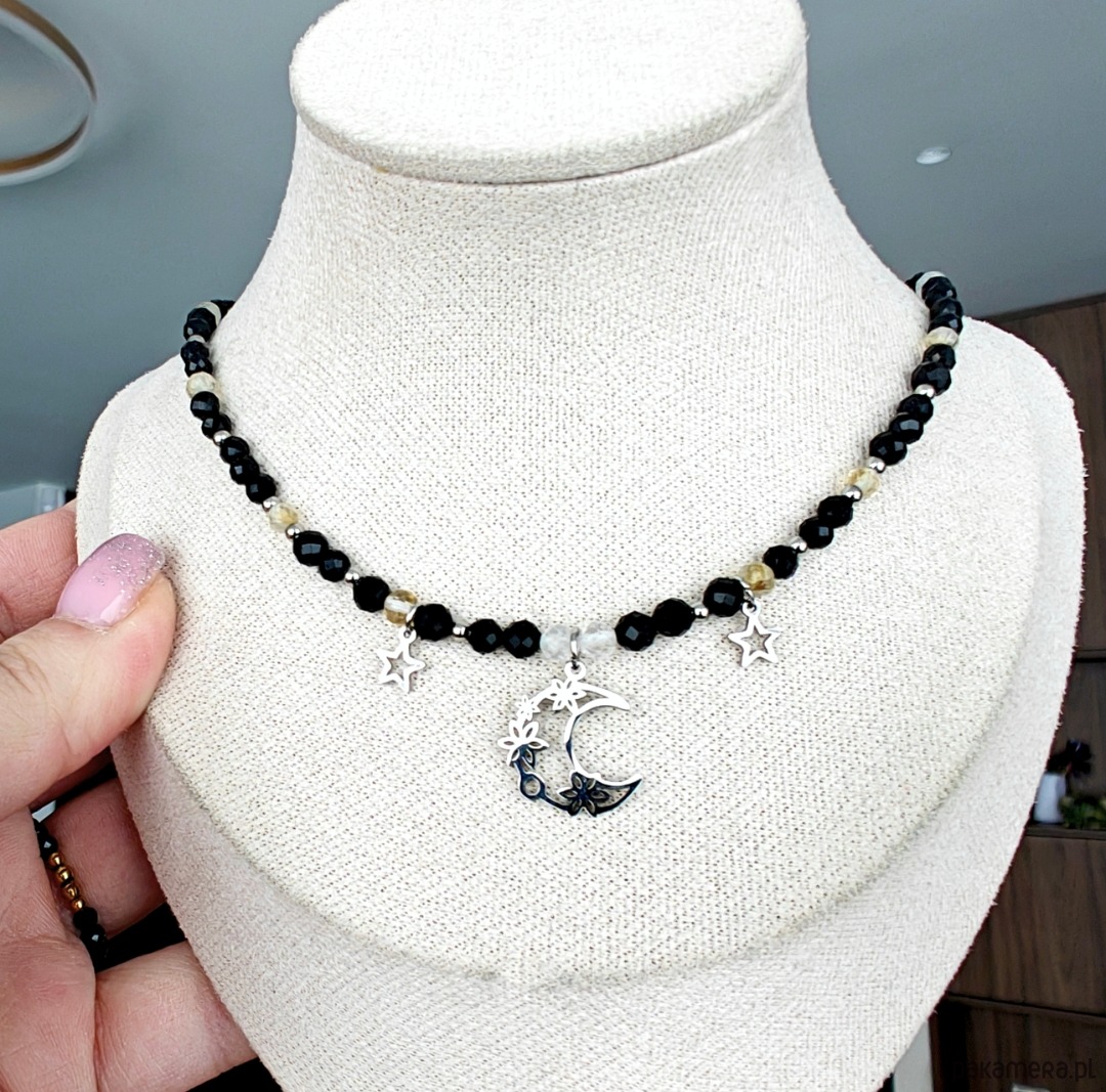 Naszyjnik o długości 42 cm z dodatkową regulacją 5 cm, wykonany z naturalnych kamieni: turmalinu oraz cytrynu. Całość uzupełniają zawieszki w kształcie księżyca i gwiazdek. Biżuterię dopełniają elementy ze stali chirurgicznej w kolorze srebra oraz drobne elementy ze srebra pozłacanego, które nadają całości subtelny blask i elegancki charakter. Dzięki regulacji długości naszyjnik można wygodnie dopasować do siebie i nosić na różne sposoby.