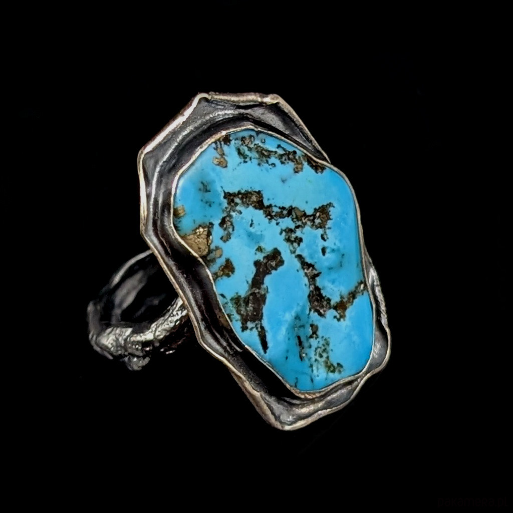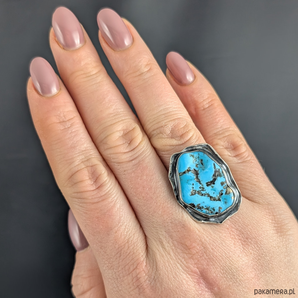 Pierścień wykonany od podstaw ze srebra, oksydowany. Rozmiar pierścionka dzięki otwartej podstawie regulowany, mogę dopasować na dowolny rozmiar w zakresie 9-22. Ozdobą pierścionka jest naturalny turkus. Wymiary oprawy kamienia 30 x 22 mm,szerokość maksymalna obrączki 6 mm, min. 4 mm. Waga 9 g. Pierścień zostanie zapakowany w ozdobne pudełeczko. Polecam w komplecie z wisiorem.