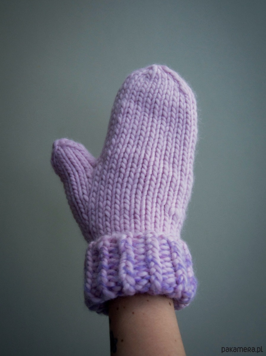 Kolorem dominującym rękawiczek jest tu jasny, peoniowy róż. Podwinięcie zawiera fioletowe przeploty.