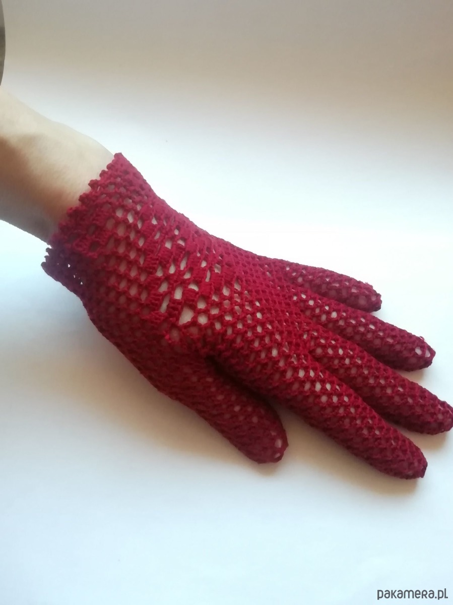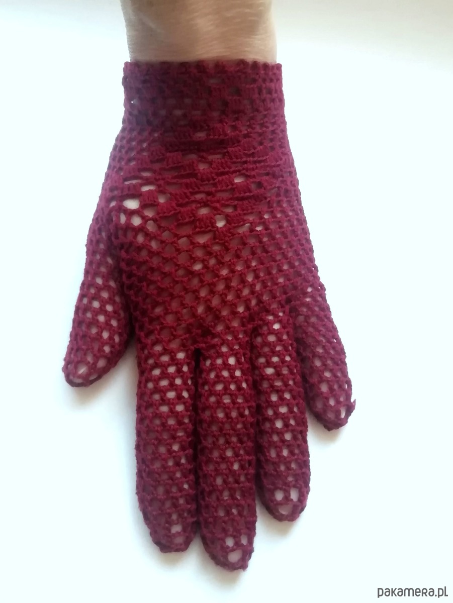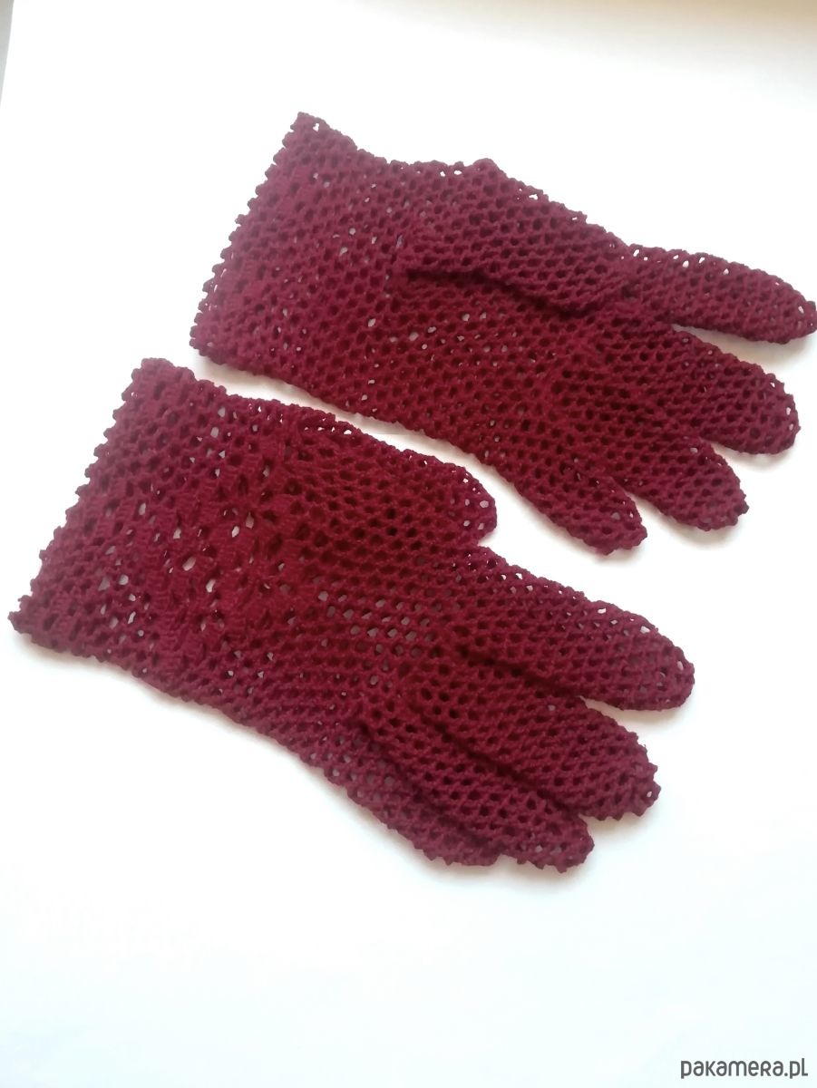 Bordowe koronkowe rękawiczki niciane. Rozmiar S/M, długie palce.