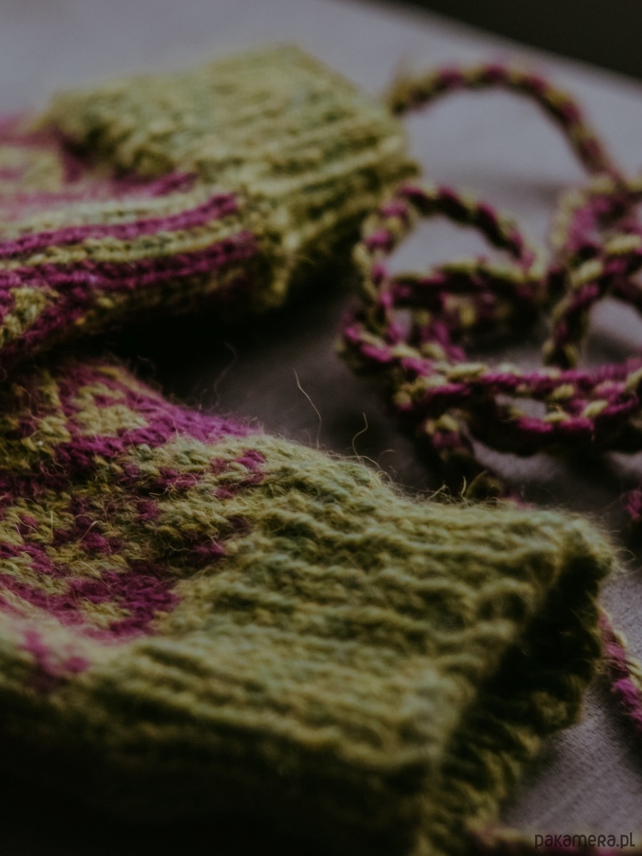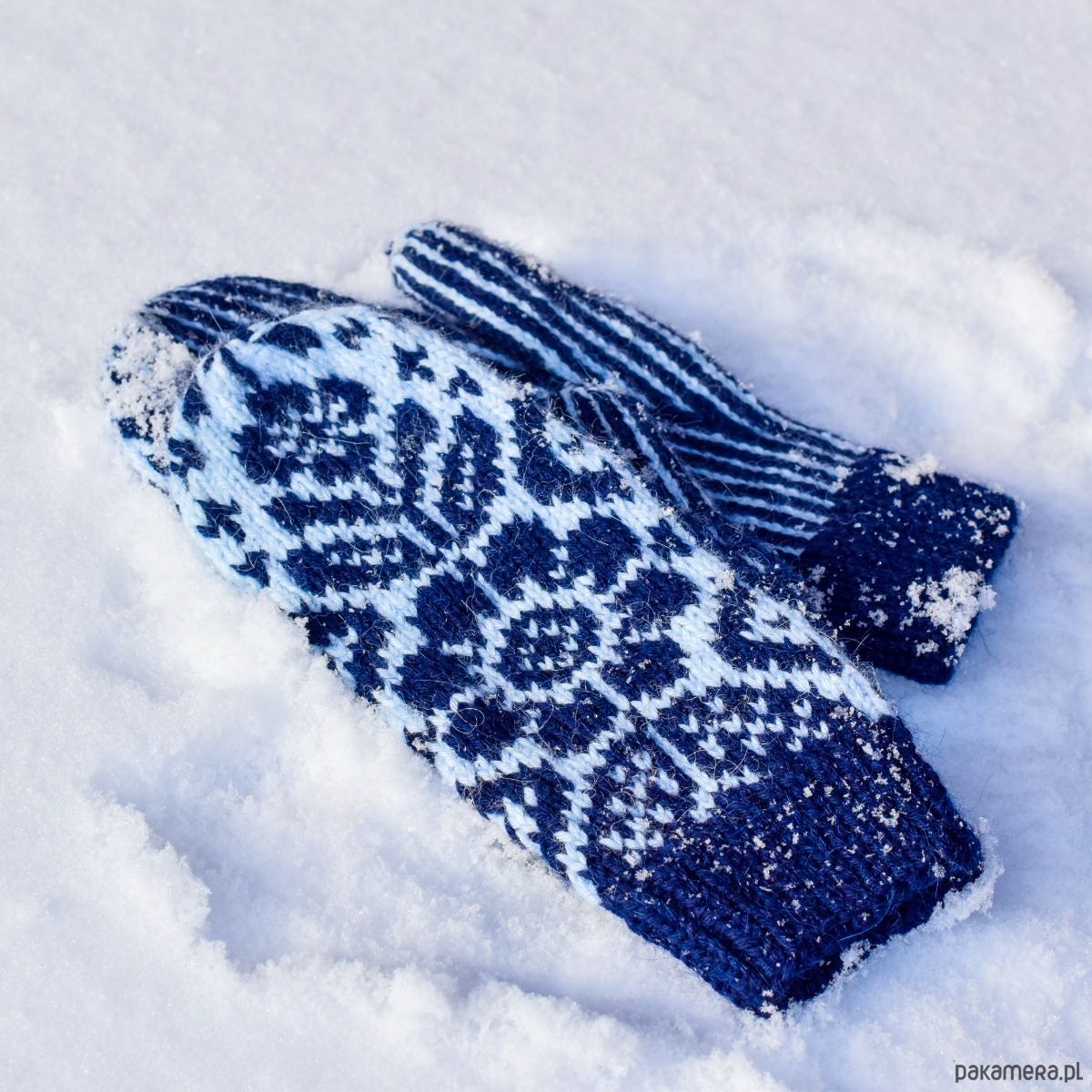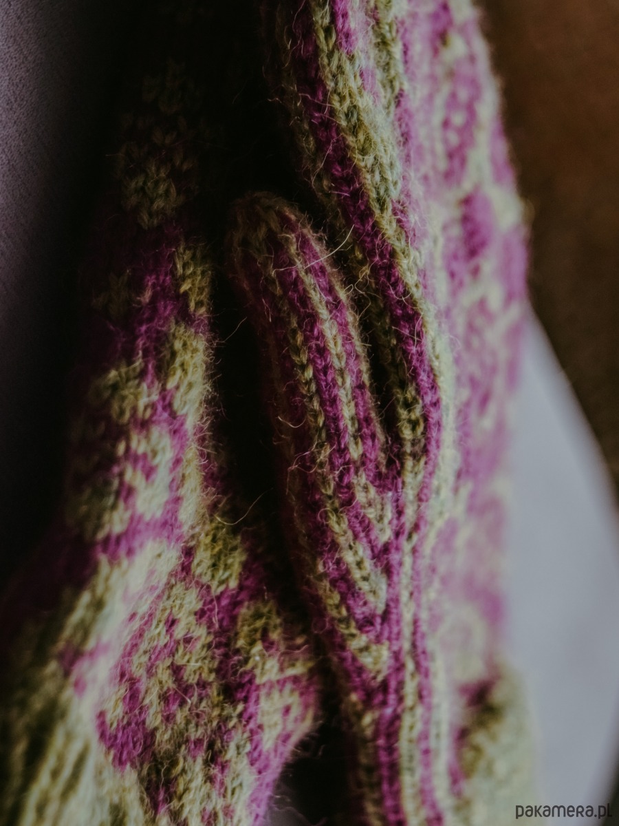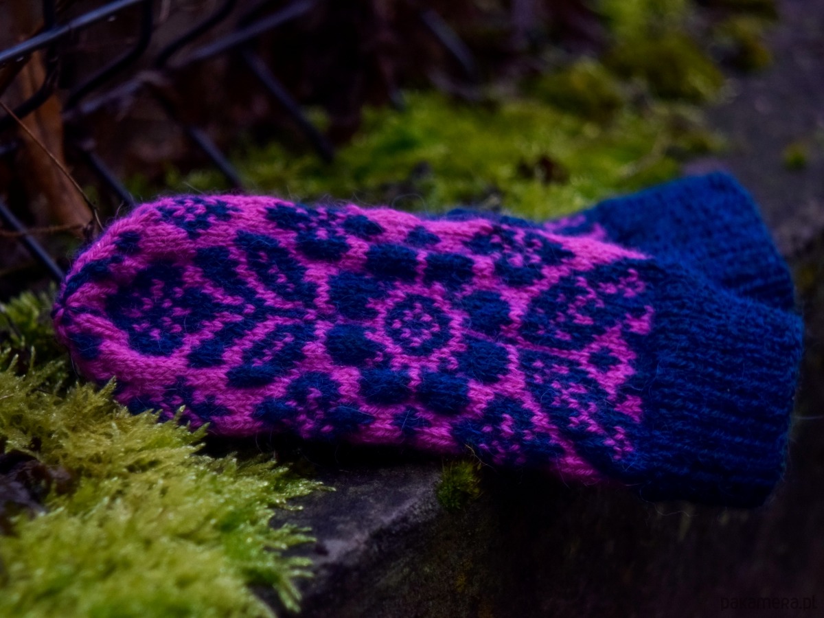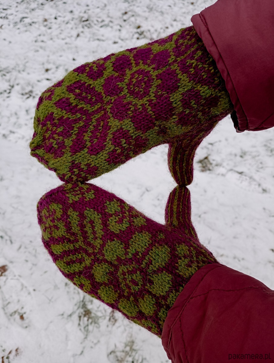 Rękawiczki z jednym palcem, urzekające kolorami i kwiecistym wzorem. Robione na drutach z włóczki z dodatkiem alpaki, dzięki czemu odziane w nie dłonie otulone są ciepłem. Włóczka ma też rustykalny charakter, a wydziergane z niej rękawiczki wyglądają jakby wyszły spod rąk naszej babci.
