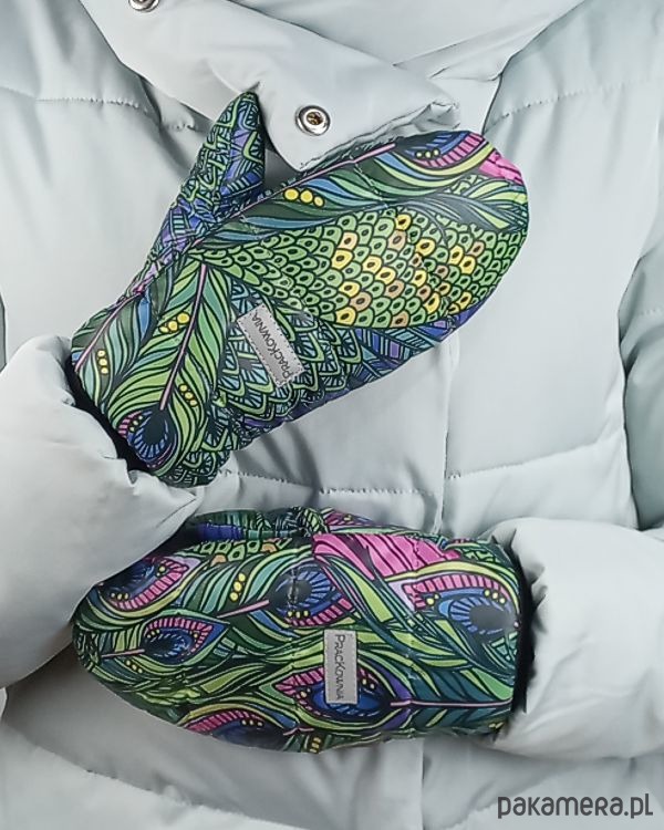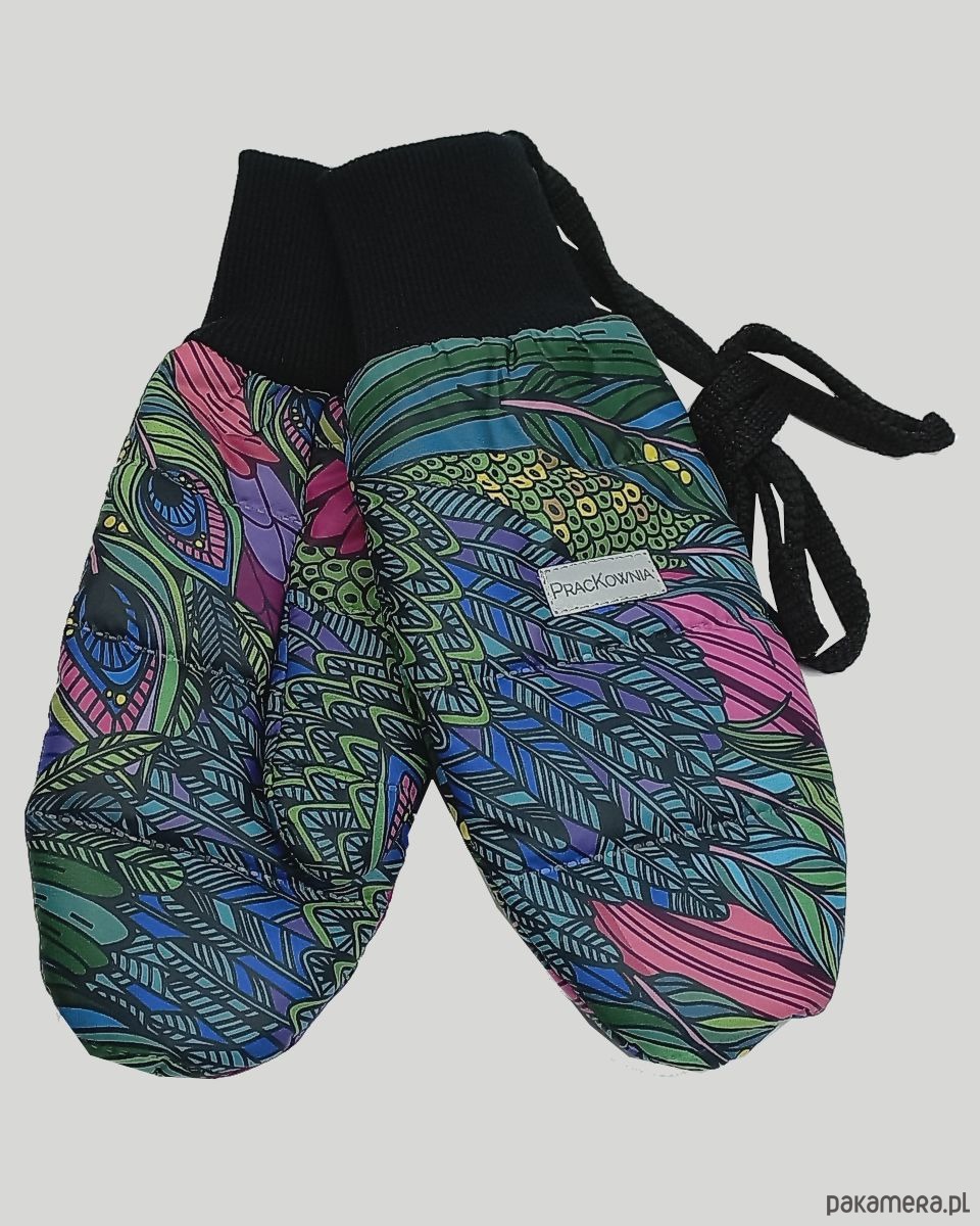 Rękawiczki z pikowanego ortalionu. Uszyte z materiału we wzór pawich piór, w środku mają warstwę ociepliny oraz dzianinową podszewkę z bawełny, wykończone są czarnym ściągaczem. Rękawiczki połączone są sznurkiem dzięki czemu wygodnie odbierzesz telefon, czy zrobisz szybkie zakupy nie martwiąc się, że je zgubisz. Na środku naszyte jest logo PracKownia, które wykonane jest z materiału odblaskowego.