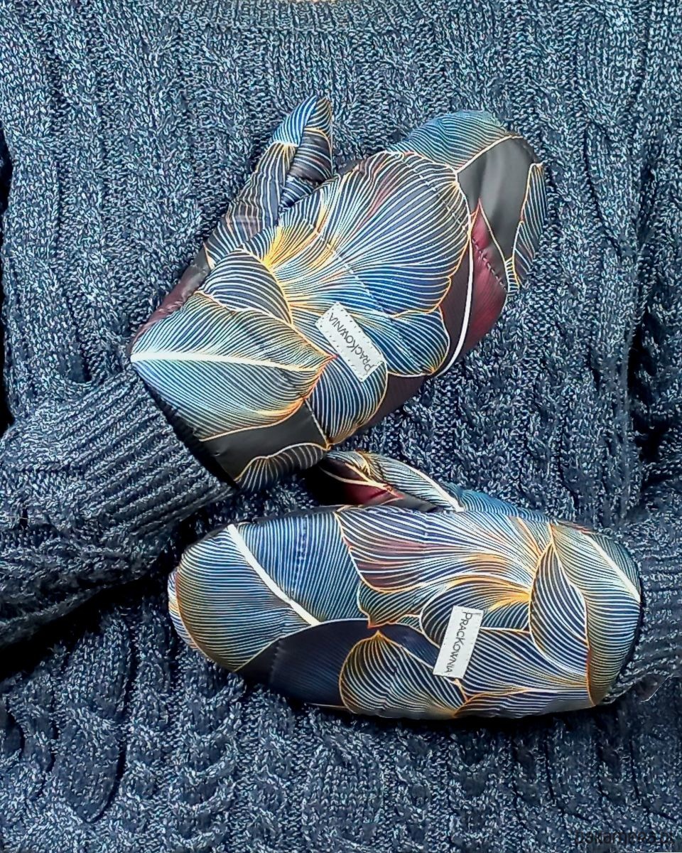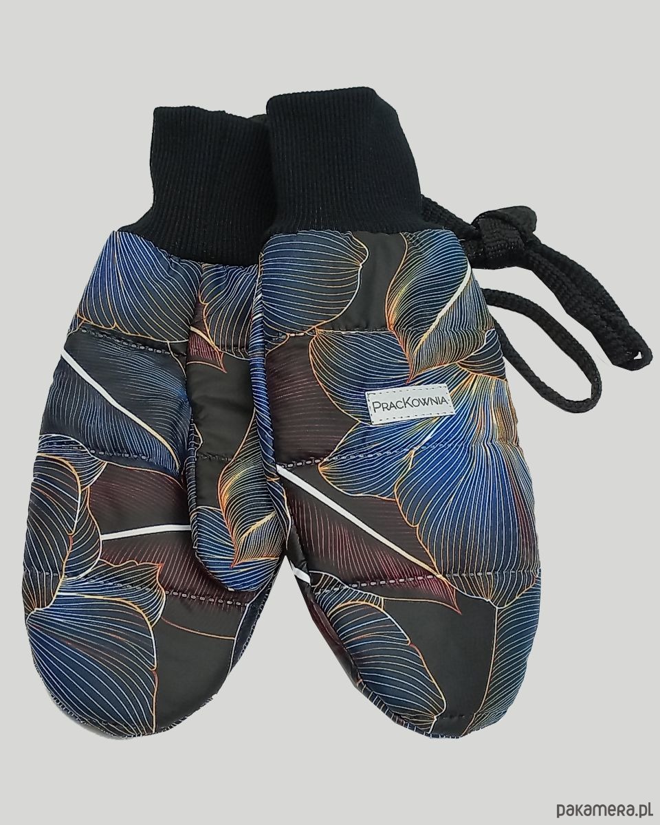 Rękawiczki z pikowanego ortalionu. Uszyte z materiału we wzór kwiatowy, w środku mają warstwę ociepliny oraz dzianinową podszewkę z bawełny, wykończone są czarnym ściągaczem. Rękawiczki połączone są sznurkiem dzięki czemu wygodnie odbierzesz telefon, czy zrobisz szybkie zakupy nie martwiąc się, że je zgubisz. Na środku naszyte jest logo PracKownia, które wykonane jest z materiału odblaskowego.