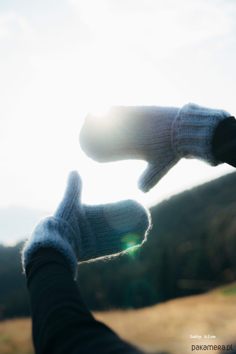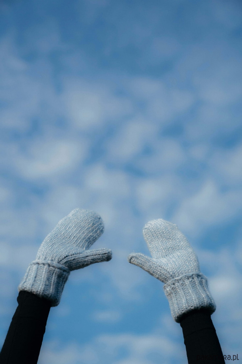 Komfortowe, lekko oversizowe dwupalczaste puchate rękawiczki z odwijanym ściągaczem.