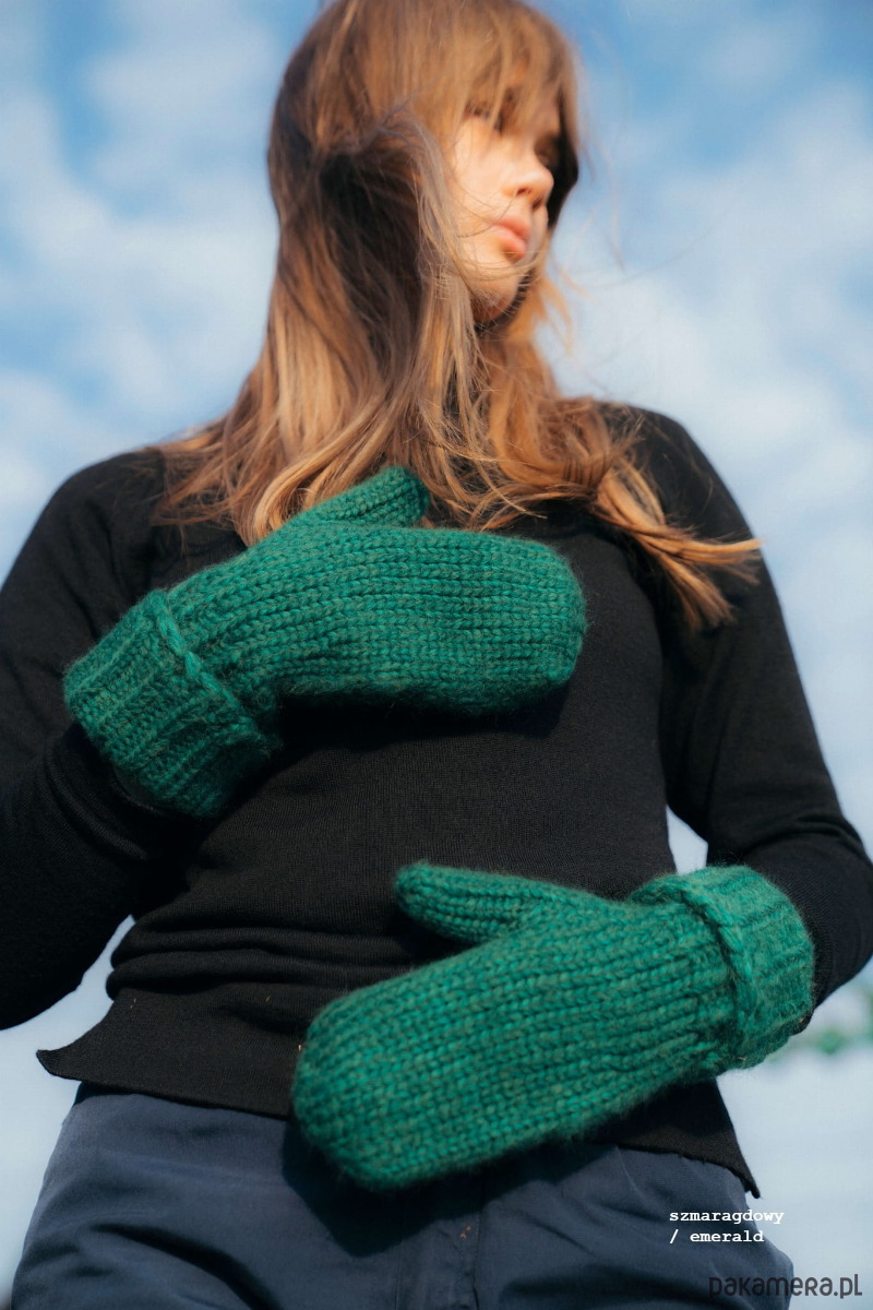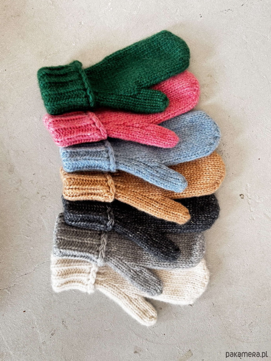 Komfortowe, lekko oversizowe dwupalczaste puchate rękawiczki z odwijanym ściągaczem.