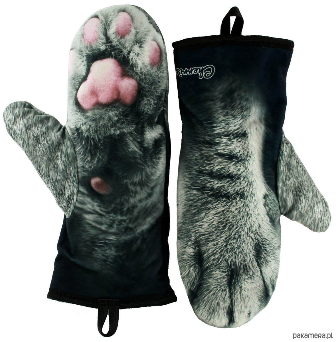 Materiał zewnętrzny: nadrukowana, mięciutka dzianina poliestrowa. Jest miła w dotyku, przypomina MIKROFIBRĘ. Na wierzchniej części dłoni znajduje się grafika kociej szarej łapy. Na wewnętrznej stronie dłoni znajduje się grafika opuszek kota.