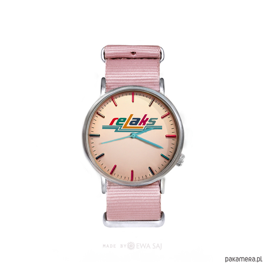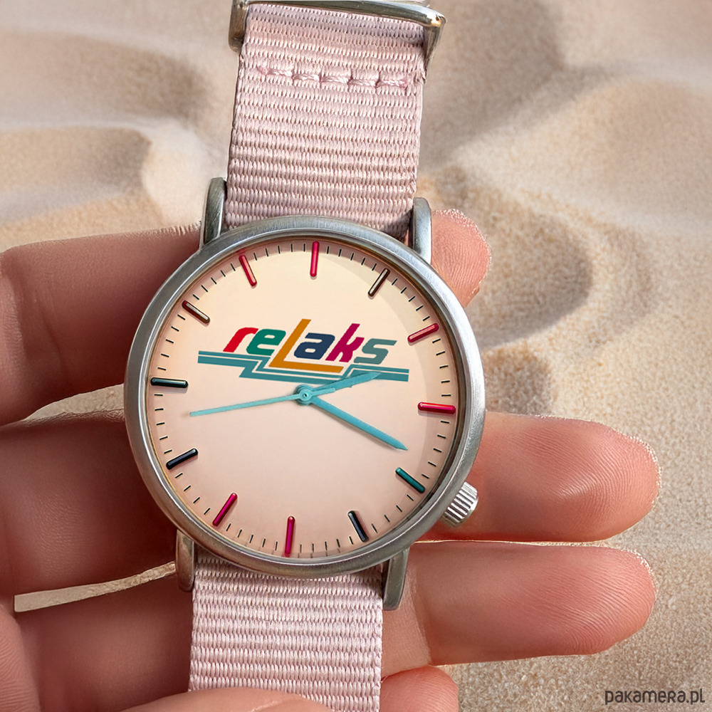 Zegarek inspirowany estetyką lat PRL. Na tarczy pojawia się kolorowy napis „Relaks” – nawiązanie do kultowego słowa, które wielu z nas pamięta z zimowych kozaków tamtych czasów.