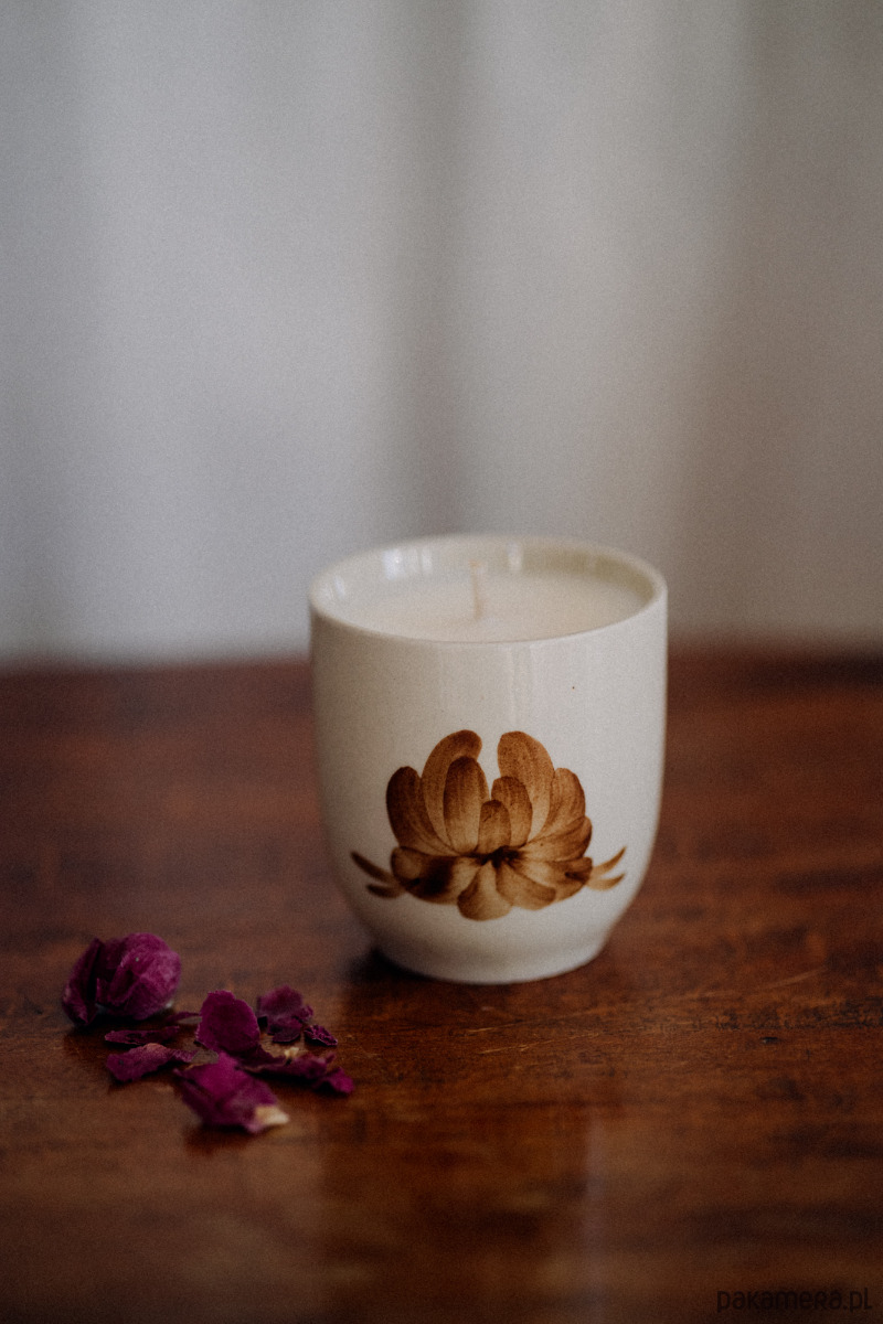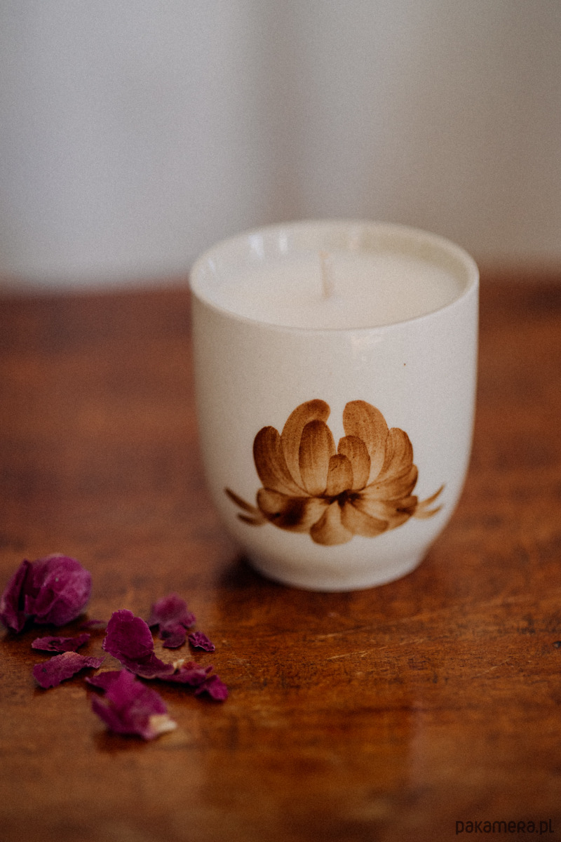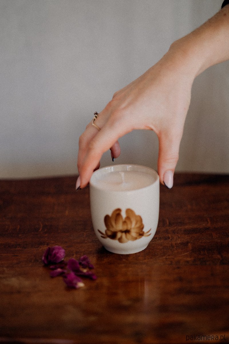 Jest w niej coś, co nas zatrzymuje i uspokaja. Zapachowa świeca sojowa w porcelitowym naczyniu vintage.