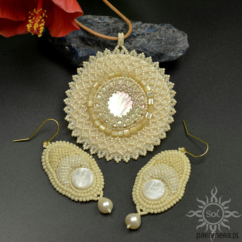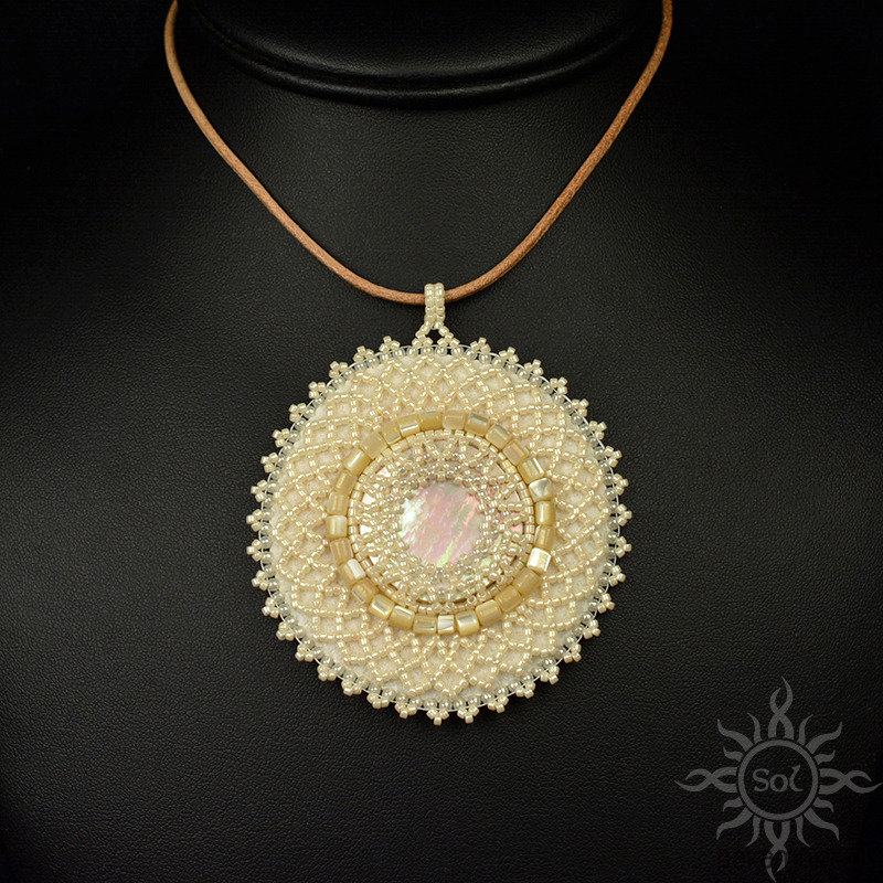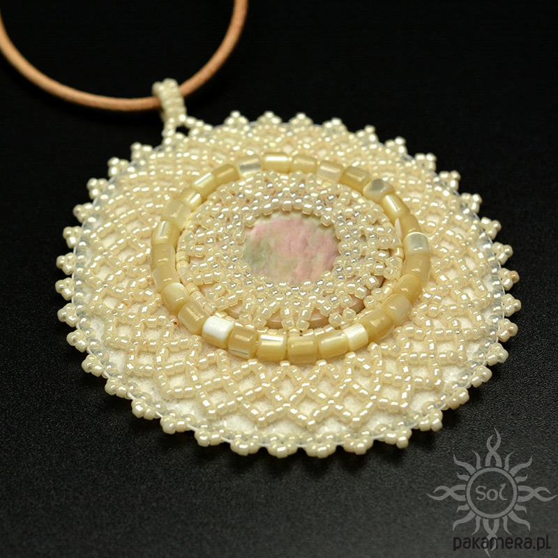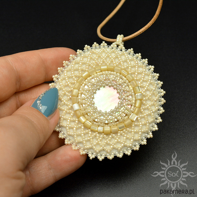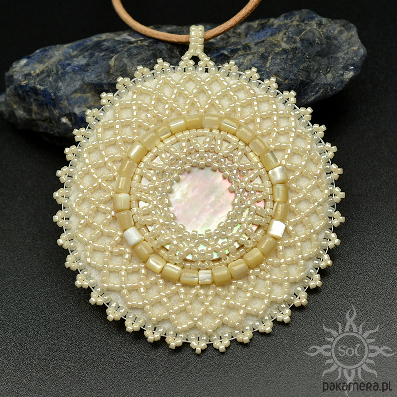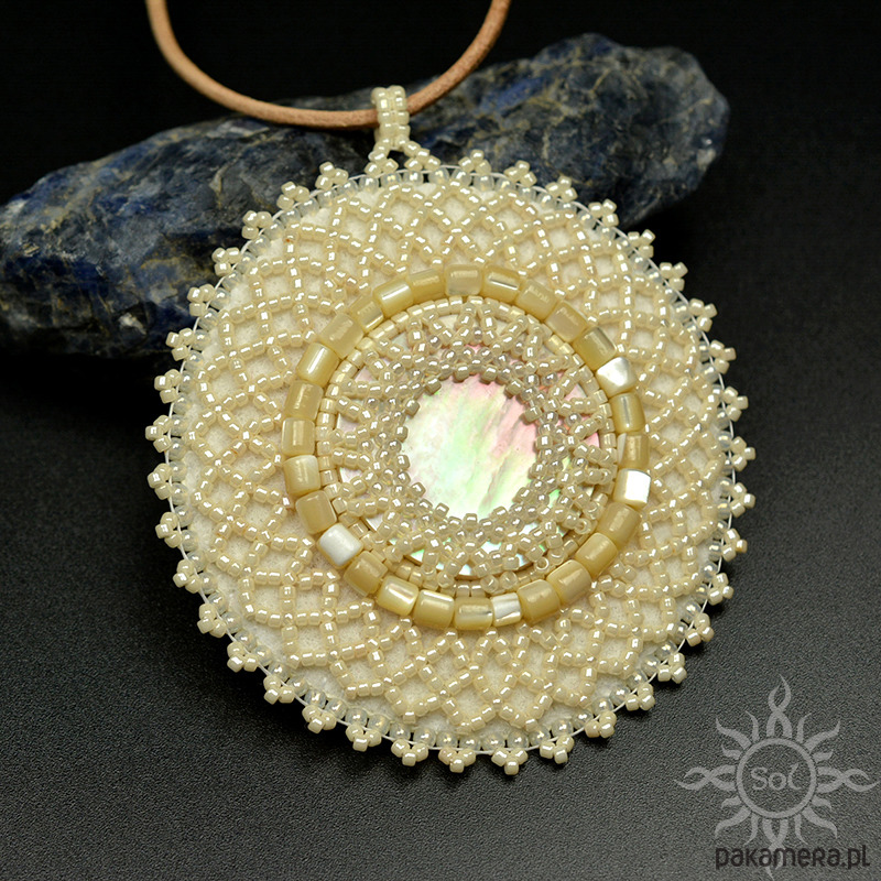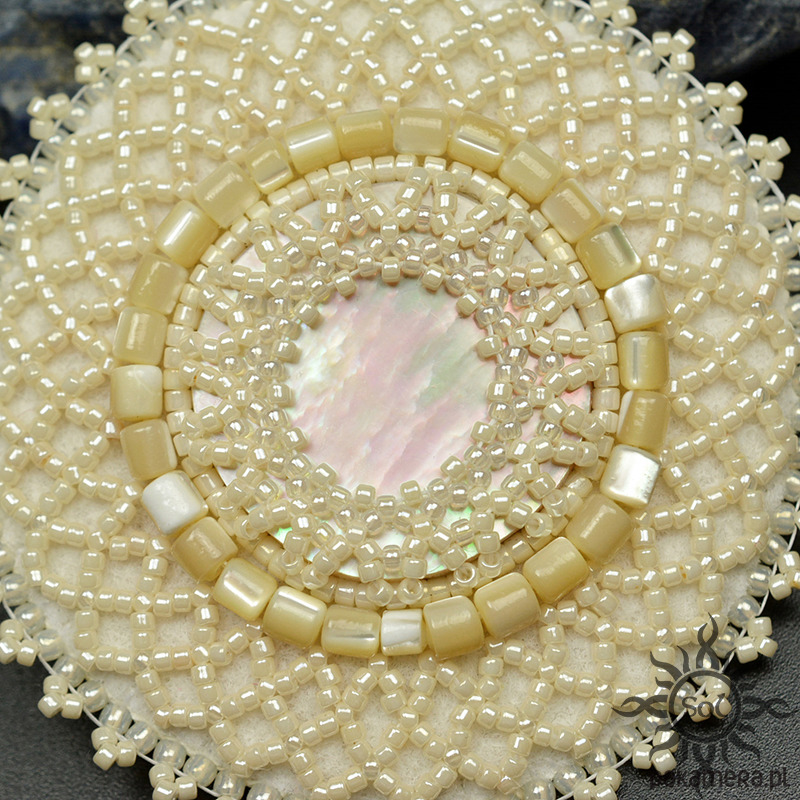 Jego serce stanowi piękny kaboszon opalizującej masy perłowej, który oplotłam najwyższej jakości japońskimi koralikami Toho w kolorze beżowym. Całości dopełnia rząd walców masy perłowej.