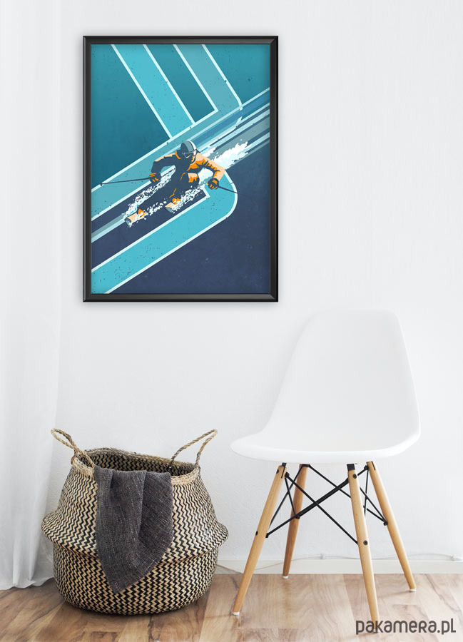Plakat w stylu vintage inspirowany narciarstwem alpejskim. Przedstawia narciarza zjeżdżającego po ośnieżonym stoku górskim. Stylizowany na plakaty podróżnicze z okresu XX-lecia międzywojennego.