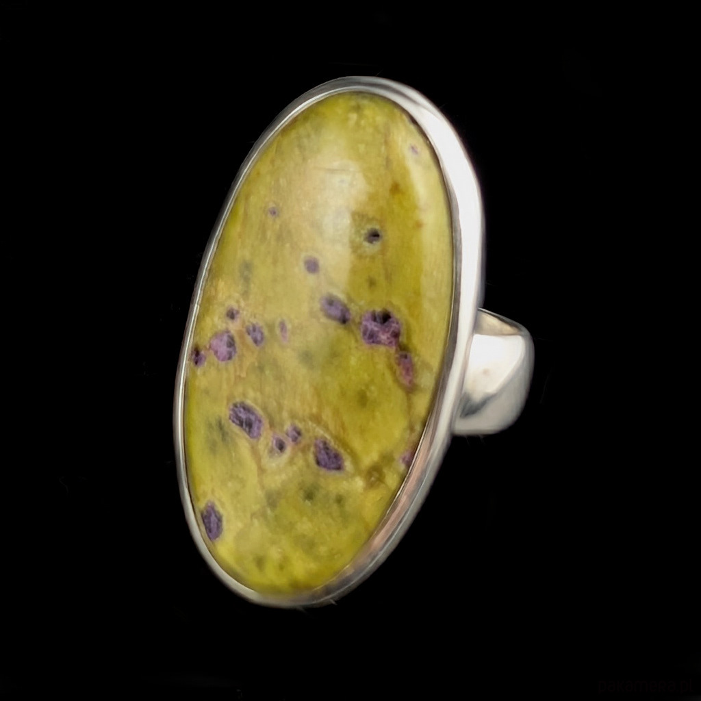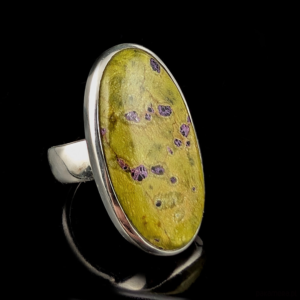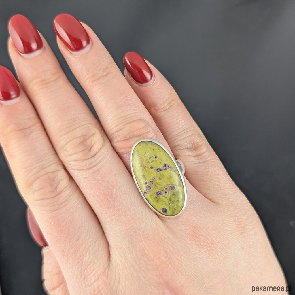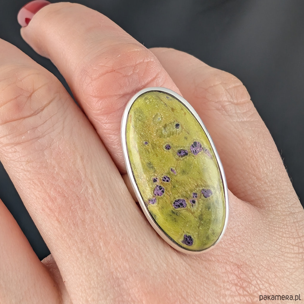 Rzadko spotykany minerał atlantysyt, który stanowi połączenie serpentynitu oraz stichtytu. Piękny kamień oprawiony w srebro próby 925. Wymiary 30 x 16 mm. Szerokość obrączki 5 mm, Rozmiar jubilerski 16. Bez mozliwości regulcji. Waga 8,8 g. Pierścień zostanie zapakowany w ozdobne pudełeczko.