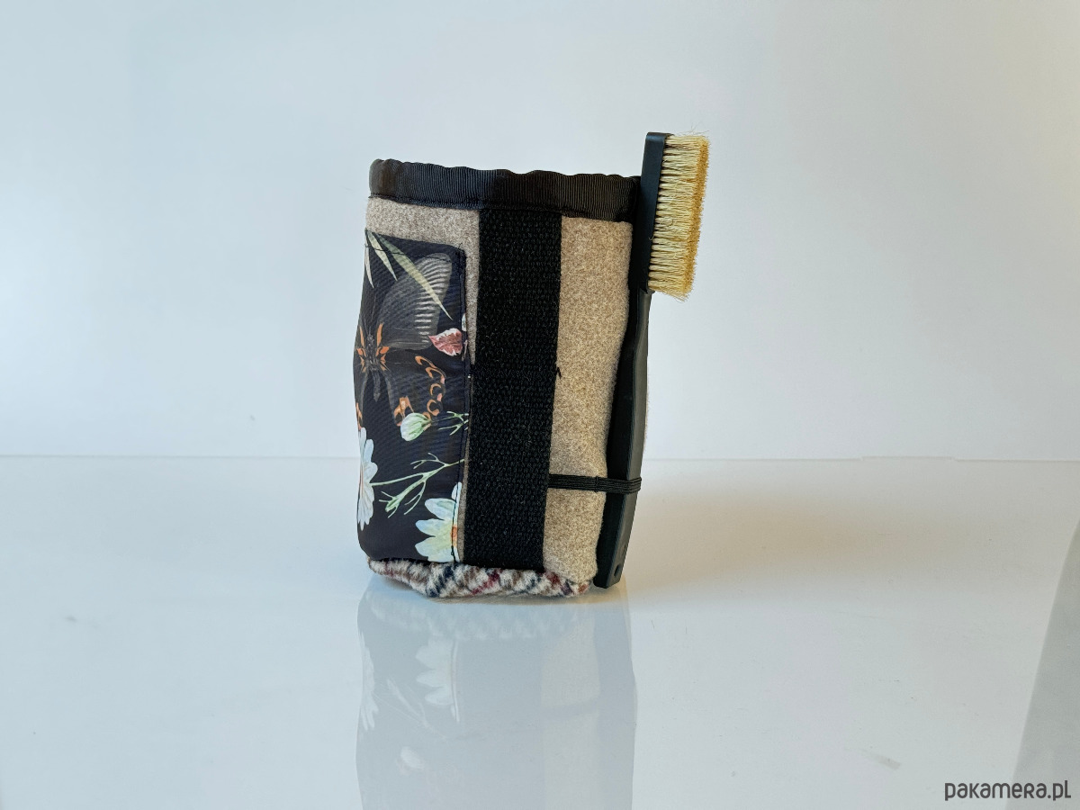 Posiada kieszonkę i uchwyt na szczotkę do chwytów.