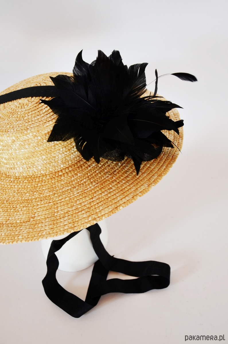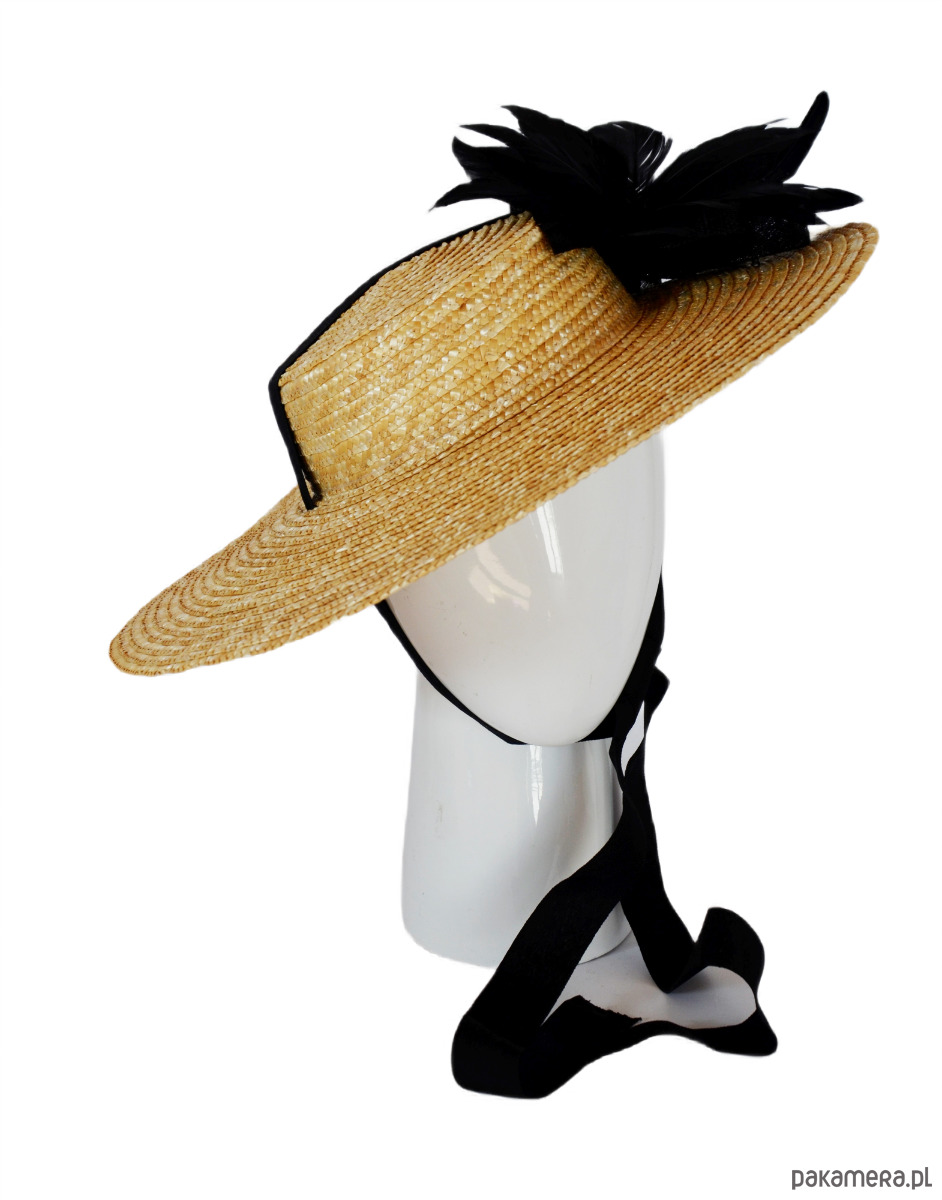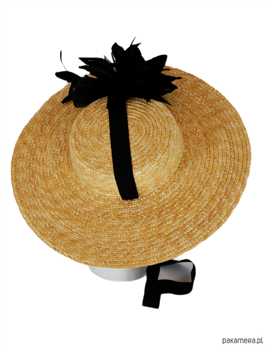 Piękny kapelusz ze słomy szytej. Wiązany wstążką pod szyją. Zdobiony kwiatem z piór i sinamay. Rozmiar uniwersalny.