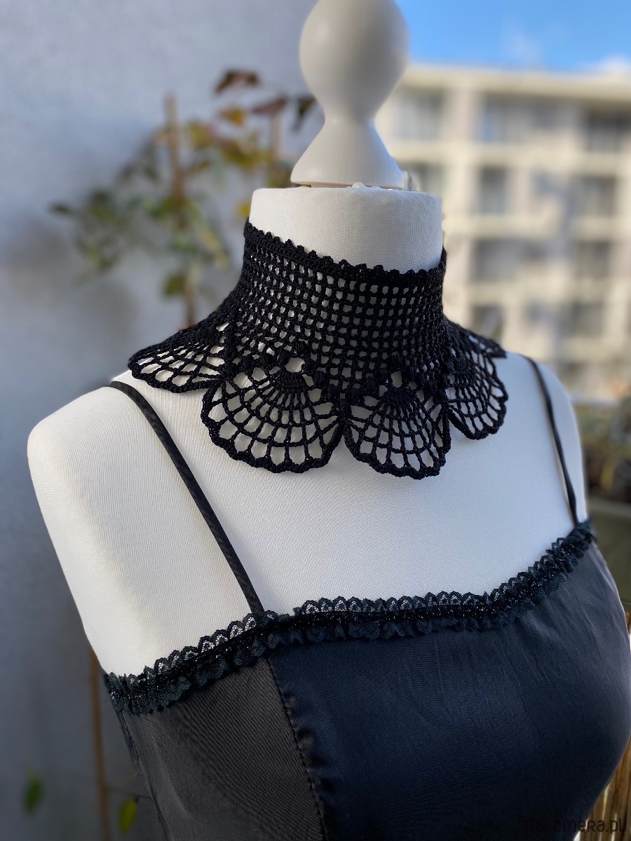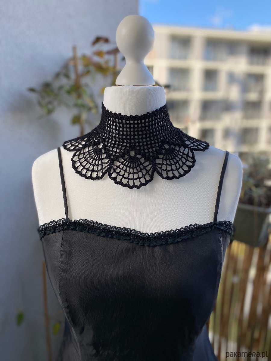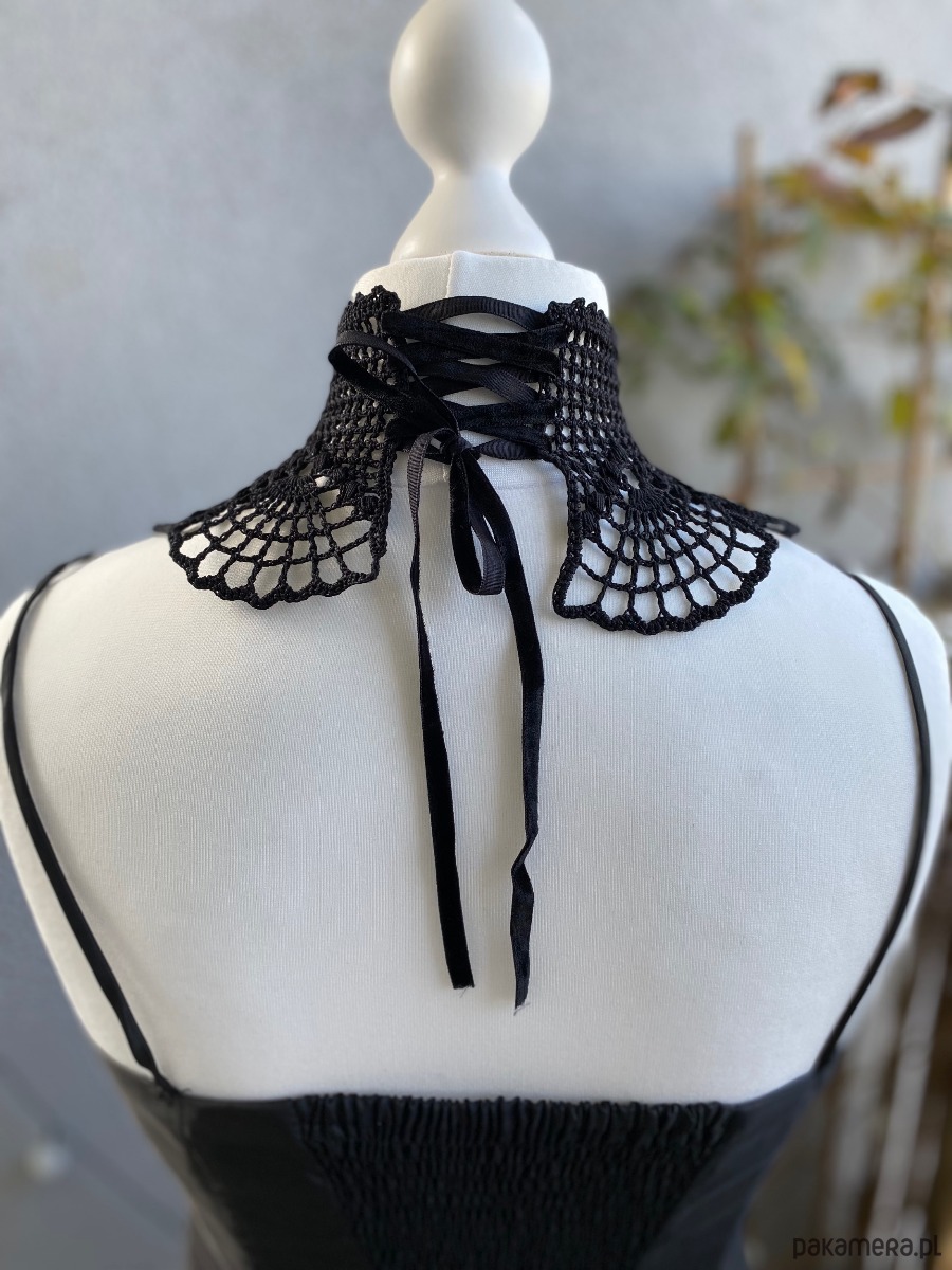 Jego wachlarzowy wzór układa się w hipnotyzujące motywy, które miękko otulają szyję, podkreślając jej linię. Z tyłu wiązany na aksamitną wstążkę, pozwala dopasować się idealnie do ciała i dodaje całości nuty tajemniczości.Będzie pasował na każdą szyję‼️ 🖤