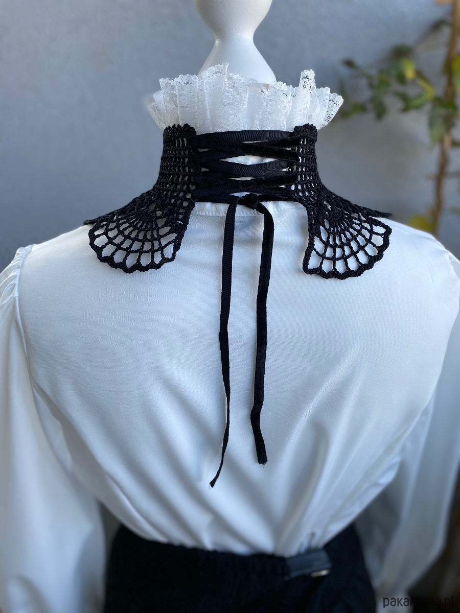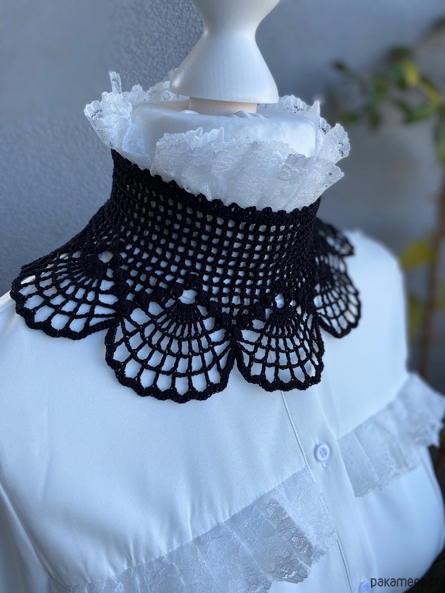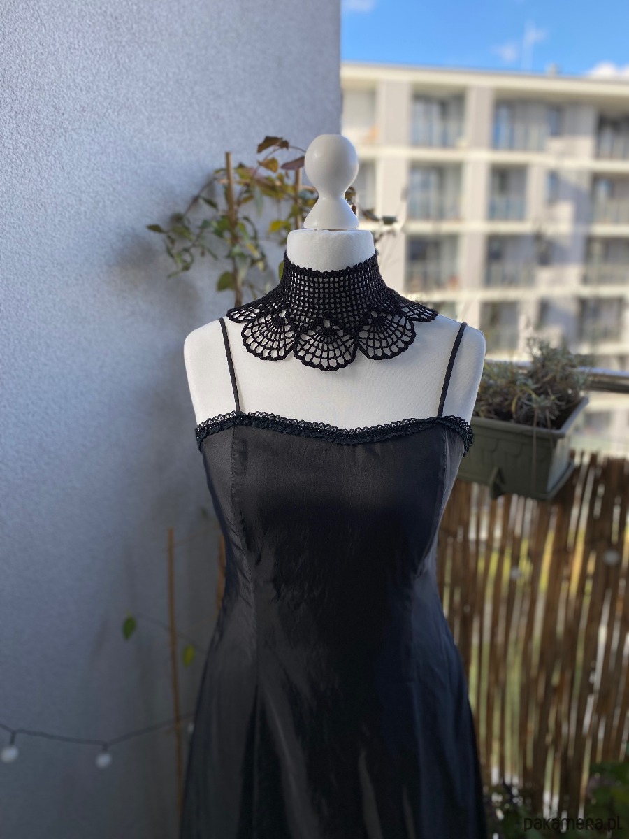 Jego wachlarzowy wzór układa się w hipnotyzujące motywy, które miękko otulają szyję, podkreślając jej linię. Z tyłu wiązany na aksamitną wstążkę, pozwala dopasować się idealnie do ciała i dodaje całości nuty tajemniczości.Będzie pasował na każdą szyję‼️ 🖤