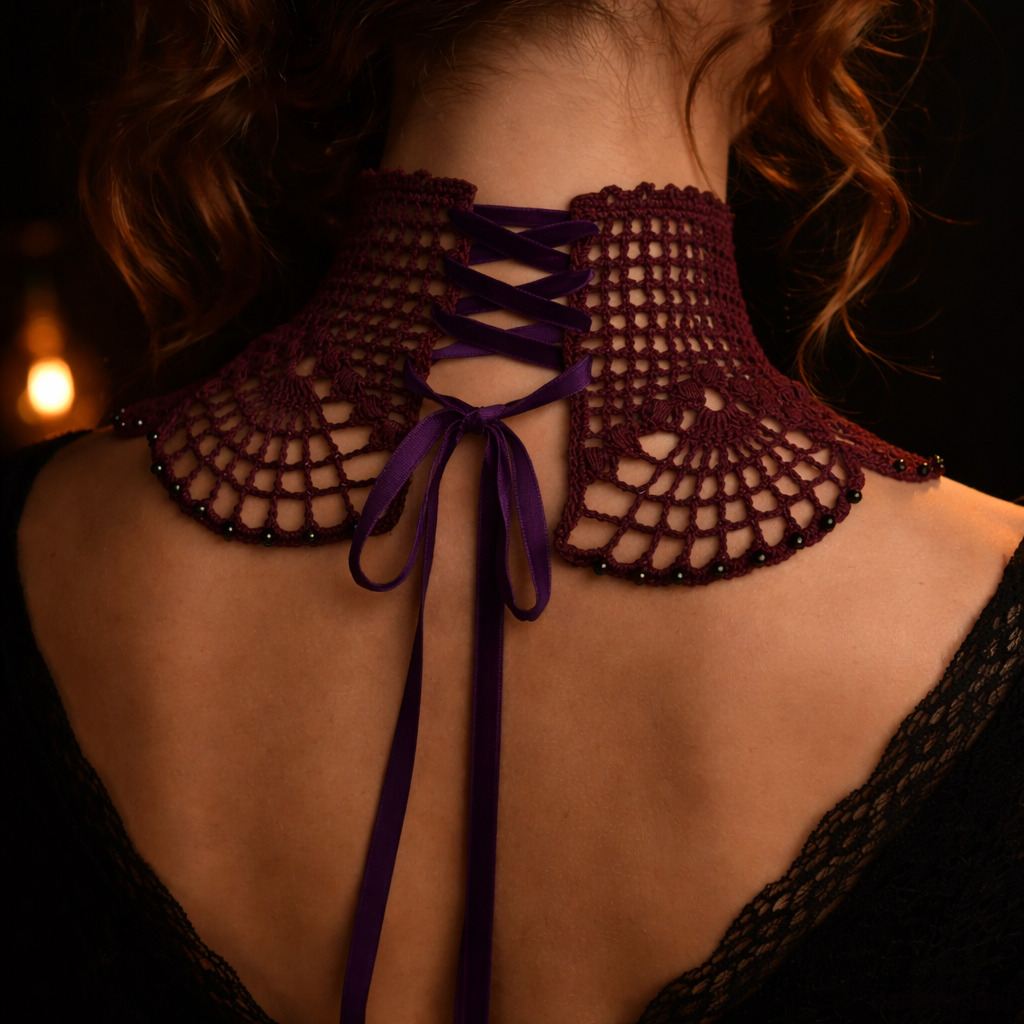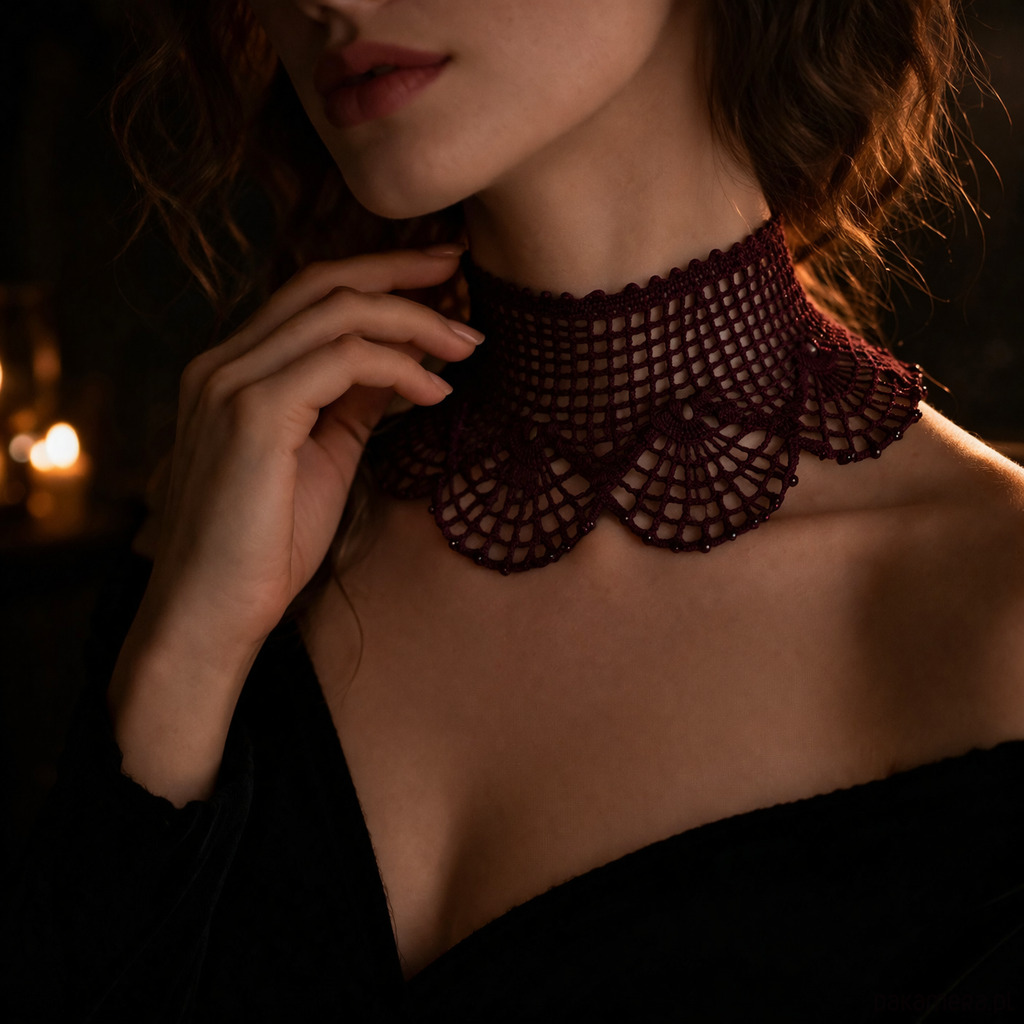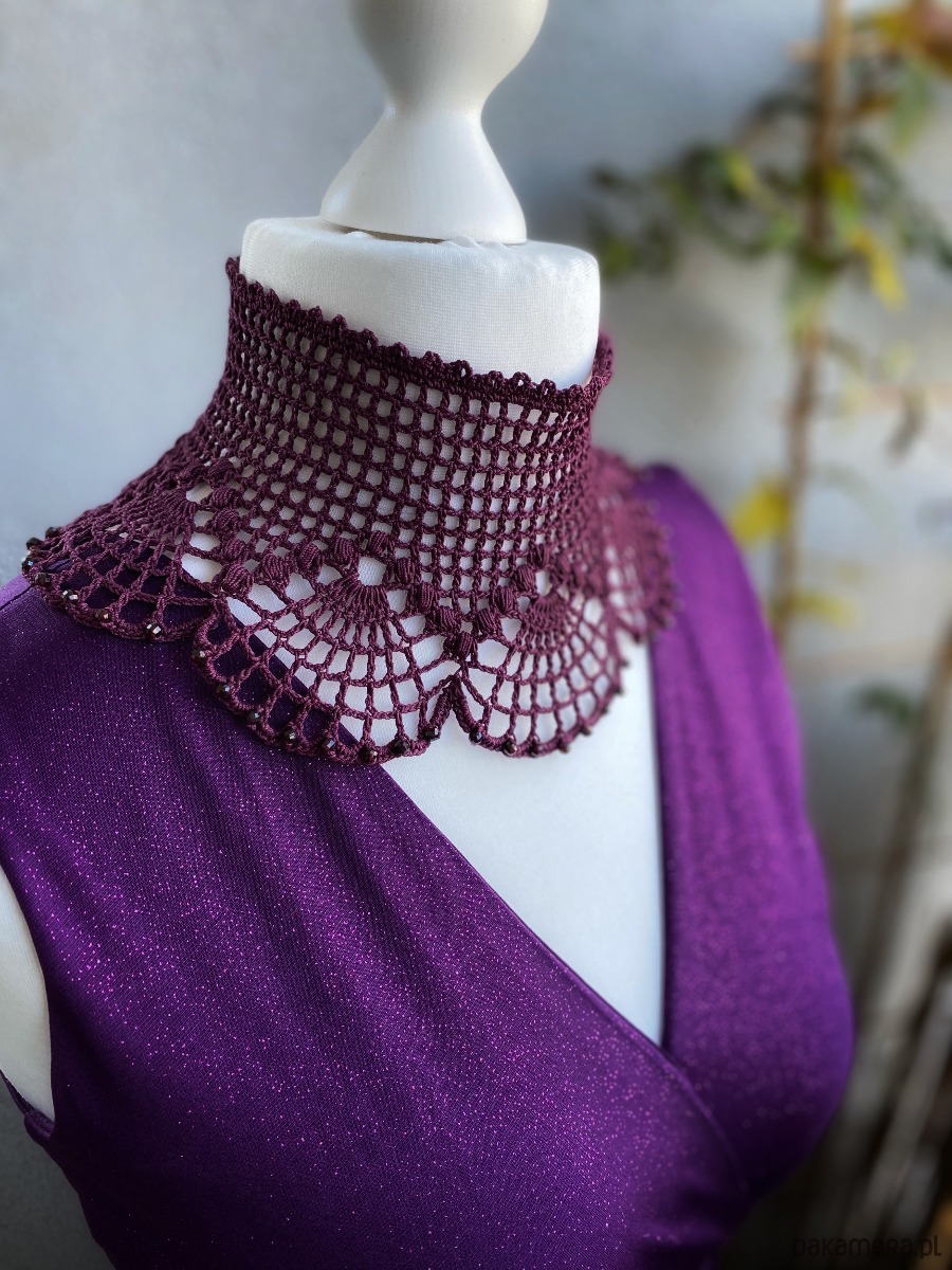 Jego wachlarzowy wzór układa się w hipnotyzujące motywy, które miękko otulają szyję, podkreślając jej linię. Ozdobiony drobnymi fioletowymi koralikami.Z tyłu wiązany na aksamitną wstążkę, pozwala dopasować się idealnie do szyi i dodaje całości nuty tajemniczości.