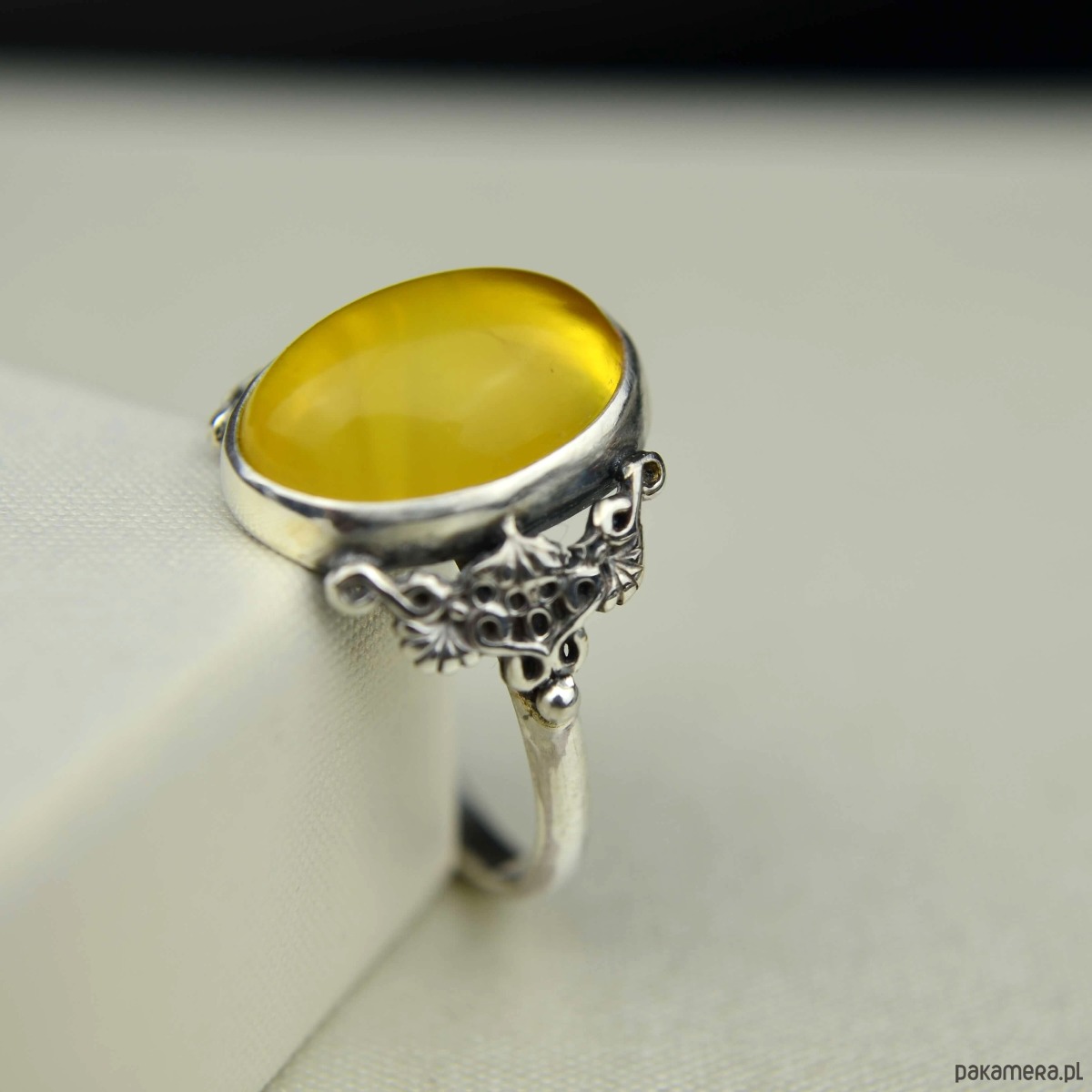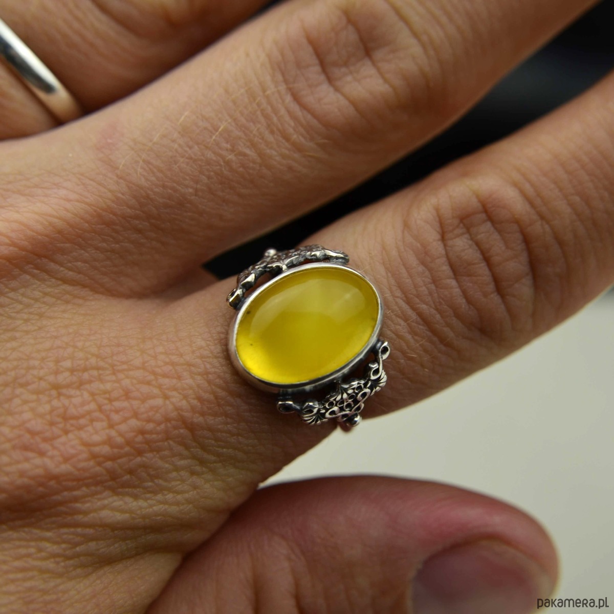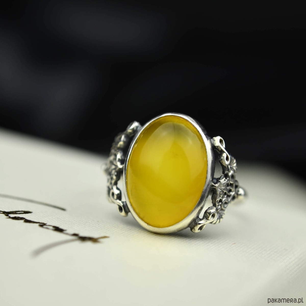 Elegancki i delikatny pierścionek w stylu vintage- wykonany ze srebra pr 925 i owalnego oczka z żółtego bursztynu z piękną chmurką. Ozdobna oprawa kamienia została zaoksydowana (przyciemniona), pierścionek przypomina wyroby dawnego pochodzenia. Idealnie sprawdzi się u Pań, które lubią stary styl biżuterii i klasyczną elegancję!