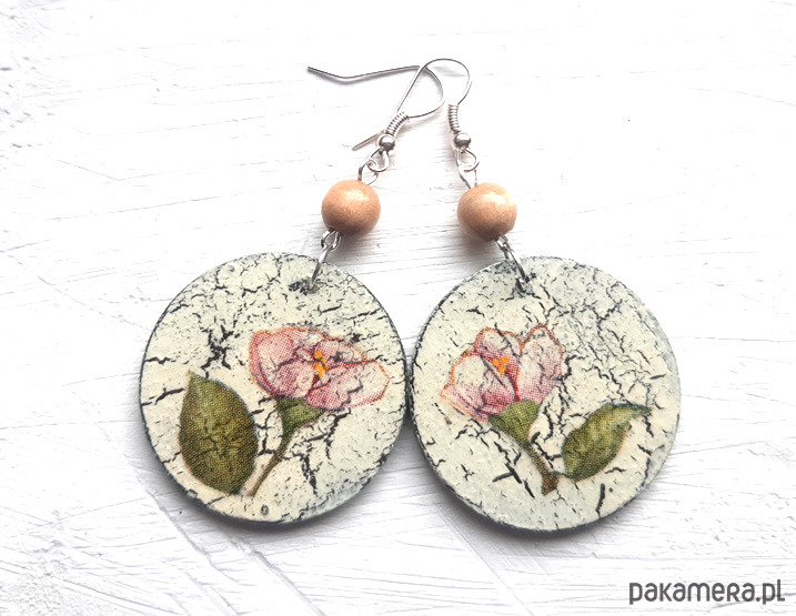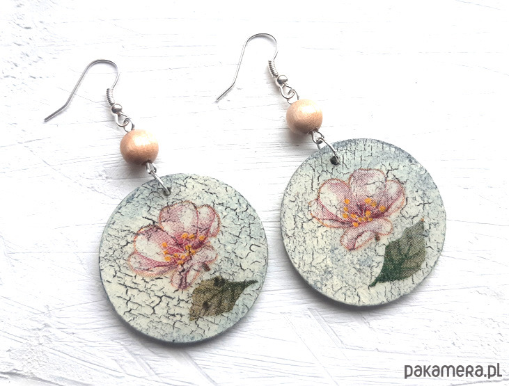 kolczyki drewniane, ozdobione metodą decoupage, dwustronne, starannie wykończone farbami akrylowymi i zabezpieczone wielokrotnie lakierem, koraliki drewniane, bigle posrebrzane, długość kolczyków bez bigli: 5 cm, średnica: 3,5 cm, bardzo lekkie