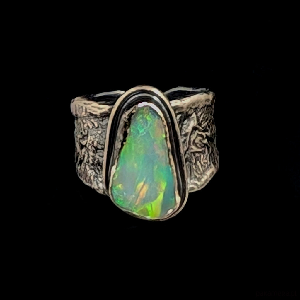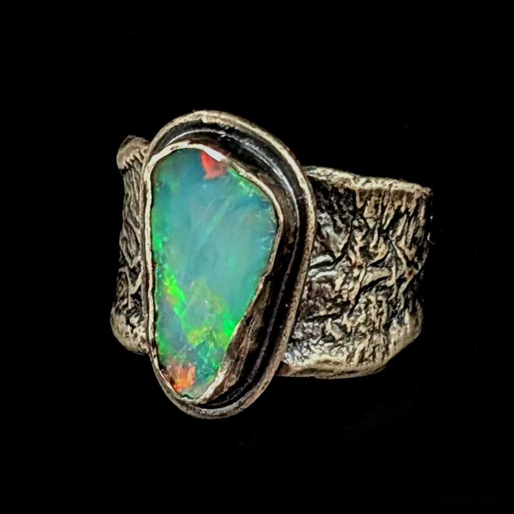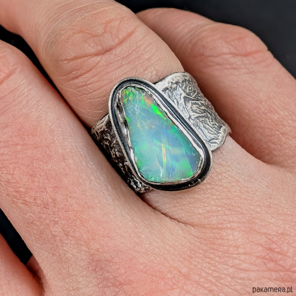 Stylizowany na retro pierścień z oprawionym surowym opalem etiopskim. Srebro pr. 925, oksyda. Wymiary oprawy 20 x 11mm. Waga 8 g. Obrączka w rozmiarze jubilerskim 15, szerokość 14 mm, mogę powiększyć na rozmiar max 16. Pierścień zostanie wysłany w ozdobnym pudełeczku.