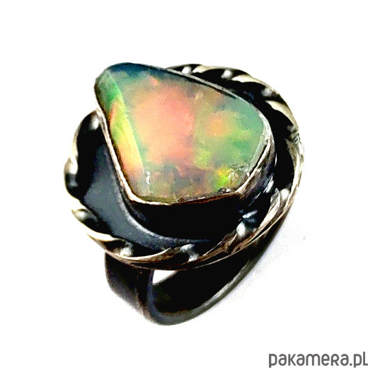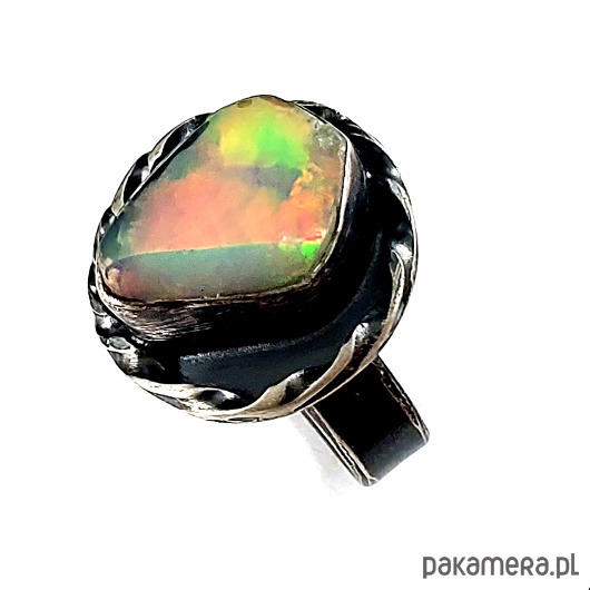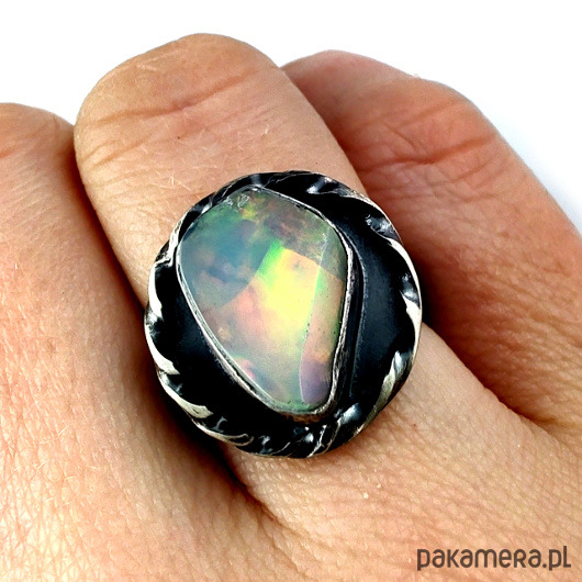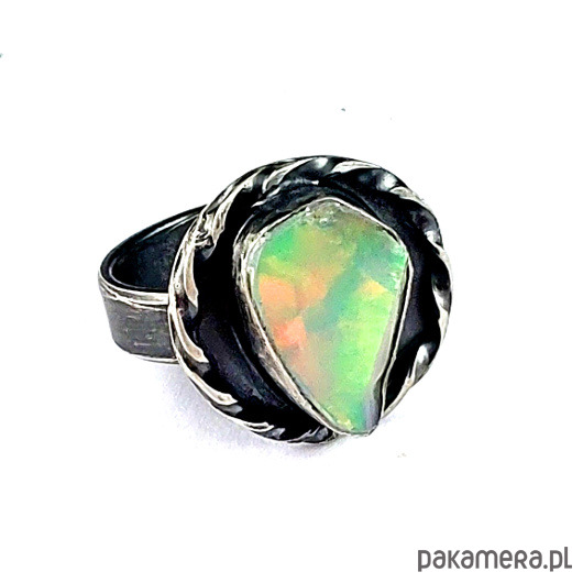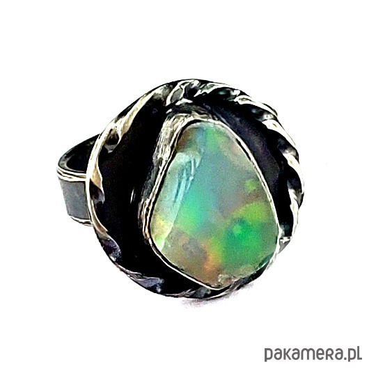 Pierścień z oprawionym szlachetnym opalem etiopskim. Kamień o wspaniałej opalizacji barw. Piękno nie do oddania na zdjęciu. Srebro pr.925, oksydowane. Wymiary oprawy średnica 18 mm. Waga 6,5 g. Rozmiar jubilerski 14, mogę powiększyć na max 15, obrączka ma 5 mm. Pierścień zostanie wysłany w ozdobnym pudełeczku.