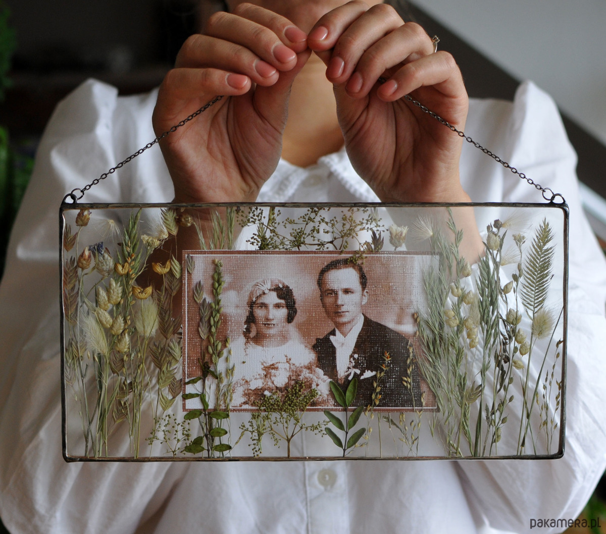 Dekoracją z suszonych, polnych traw i kwiatów.