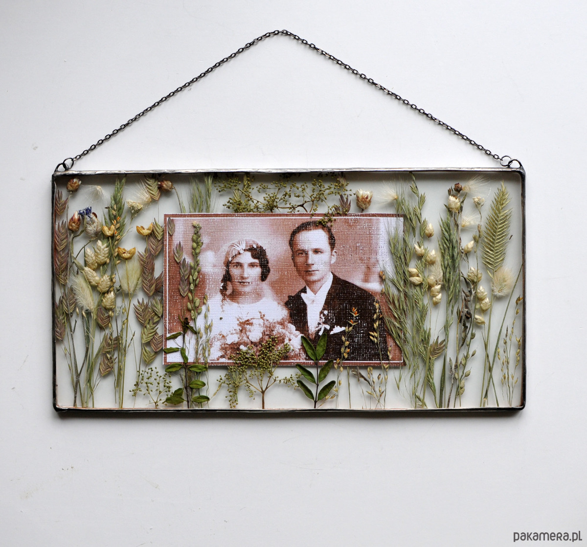 Dekoracją z suszonych, polnych traw i kwiatów.