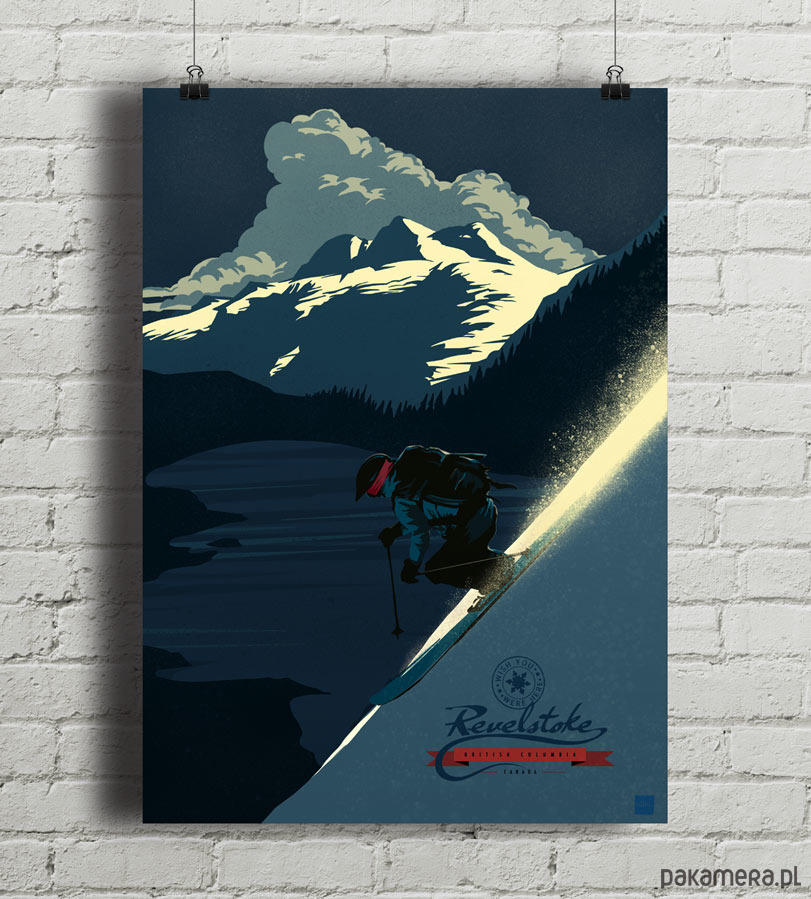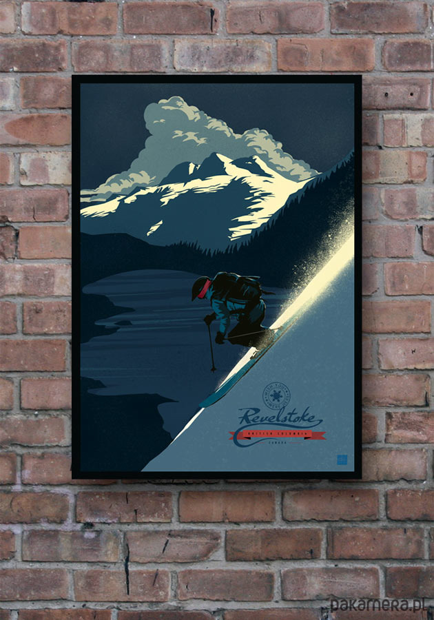 Plakat w stylu vintage z autorską grafiką inspirowaną narciarstwem alpejskim. Przedstawia narciarza zjeżdżającego po ośnieżonym stoku górskim w okolicach Revelstoke w Kolumbii Brytyjskiej (Kanada). Inspirowany plakatami podróżniczymi z lat 20-tych XX wieku.