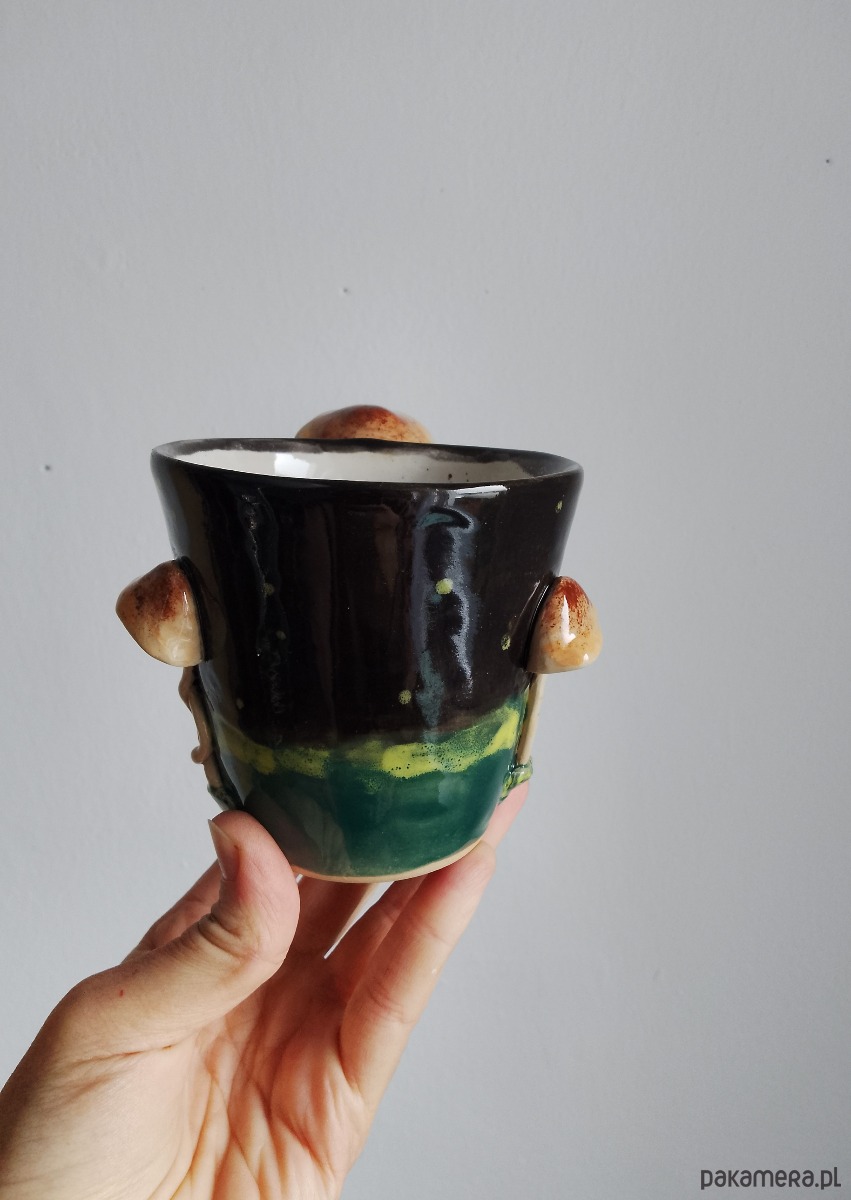 Kubek ceramiczny z uchem w kształcie grzybka o pojemności około 300 ml.