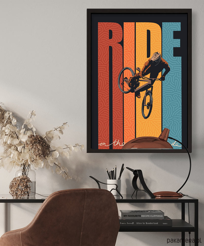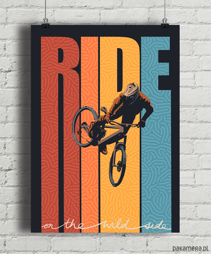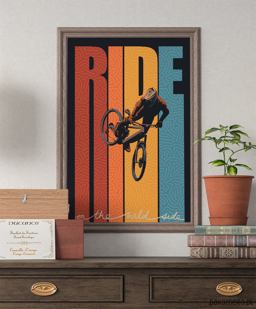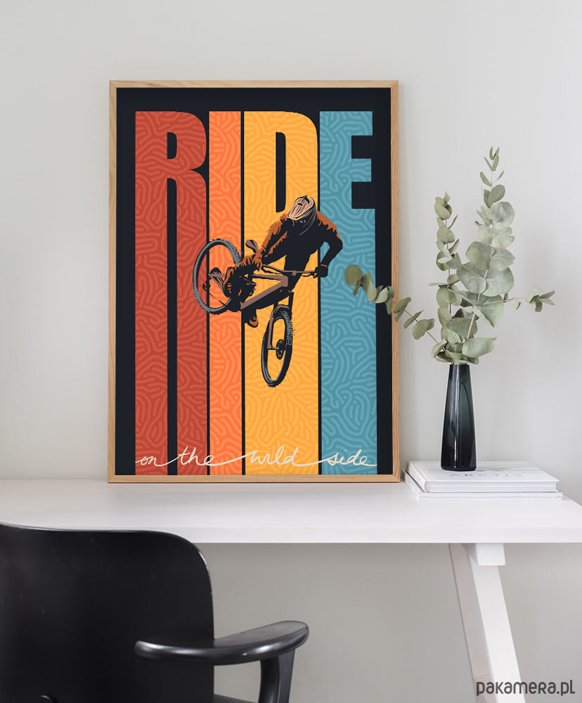 Autorski plakat rowerowy "Ride on the wild side" dla wszystkich, dla których rowerowa pasja jest szaloną stroną. Soczyste kolory grafiki dodadzą charakteru każdemu wnętrzu.
