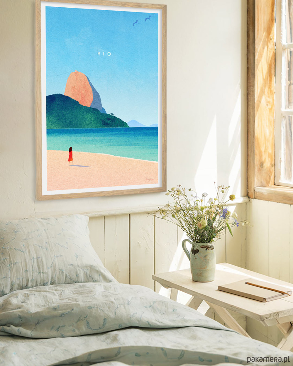 Słynna góra Pão de Açúcar w Brazylii stanowi jeden z bardziej rozpoznawalnych punktów Rio. Plakat podróżniczy „Rio De Janeiro Brazylia - Głowa Cukru” ukazuje ten urokliwy szczyt z perspektywy pobliskiej plaży. Tak ujęte Rio zdaje się uosobieniem rajskiego wypoczynku.