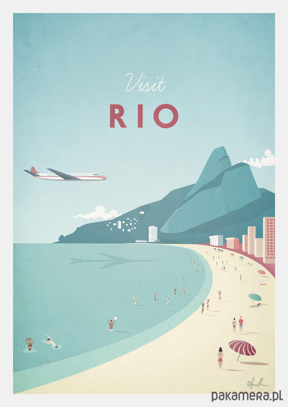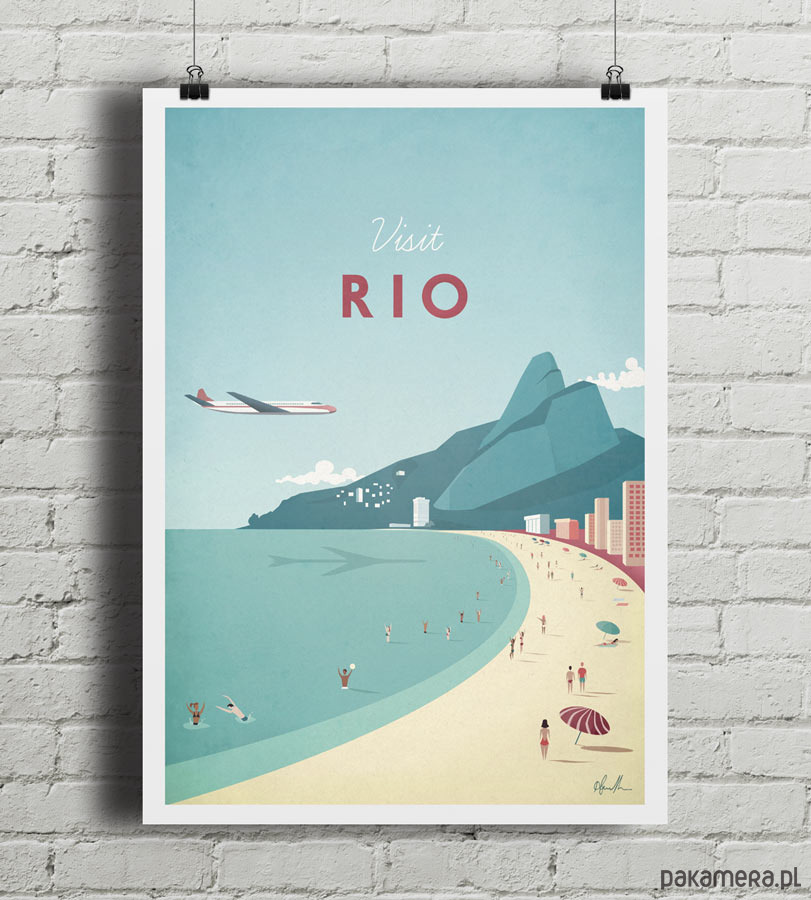 Plakat w stylu vintage przedstawiający słynną plażę Ipanema w Rio de Janeiro w Brazylii. Inspirowany plakatami podróżniczymi z lat 20-tych XX wieku.