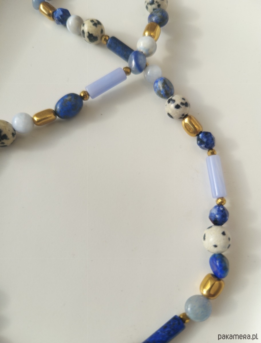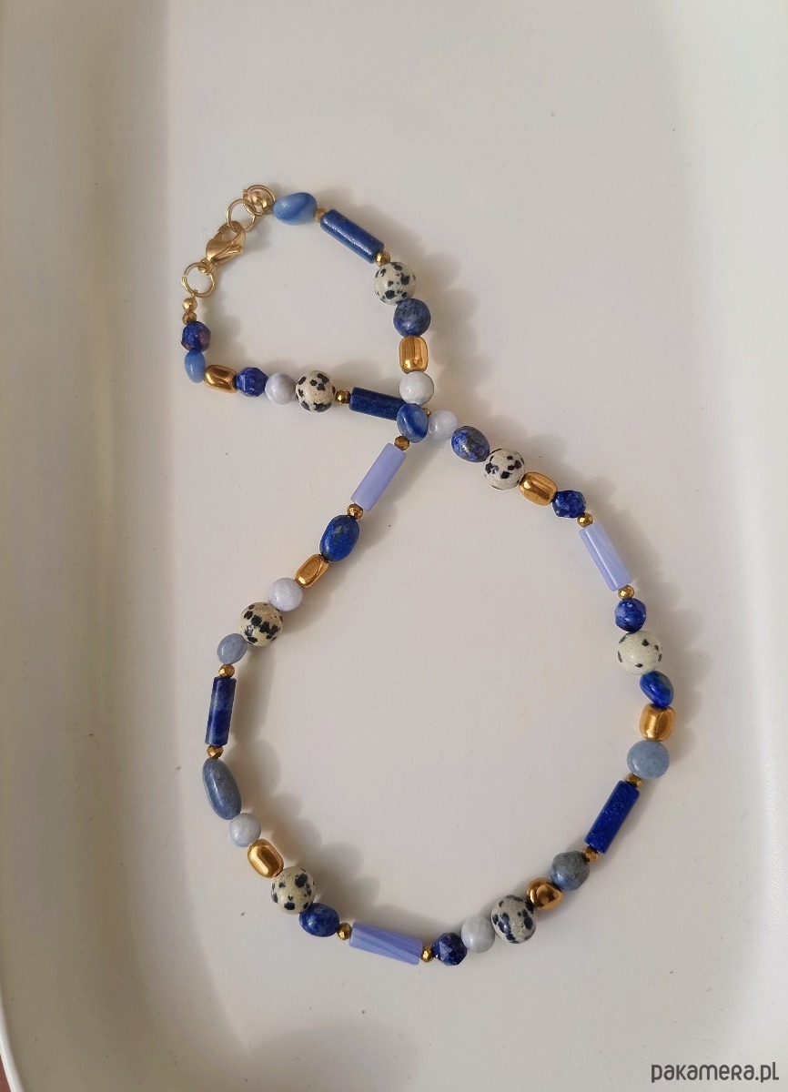 Naszyjnik w niebieskiej tonacji z miksu kamieni lapis lazuli,agatów,hematytów,jaspisu dalmatyńskiego na nici jedwabnej zakończonej zapięciem ze stali chirurgicznej.Złote elementy "bryłki" są z naturalnego kamienia hematytu i zachowują swoją barwę podczas użytkowania. Dodatkowo hematyt jest uznawany jako kamień ochraniający.