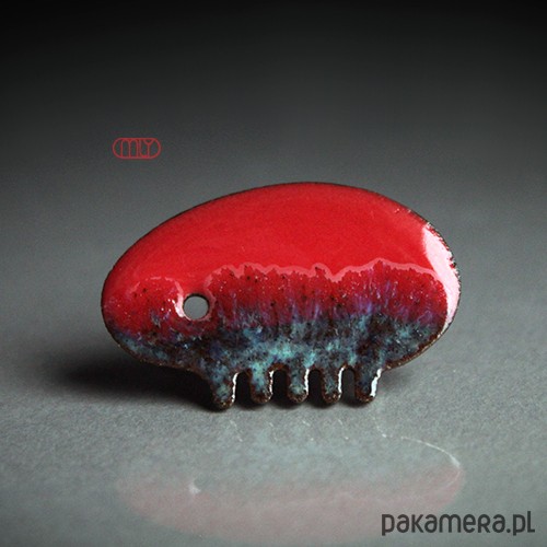 Oryginalna ceramiczna broszka inspirowana motywami biologicznymi, wykonana z gliny kamionkowej, szkliwiona subtelnie błyszczącym zielonym i czerwonym szkliwem, zapięcie w kolorze starego złota . Długość ok. 3,7cm. Polecam