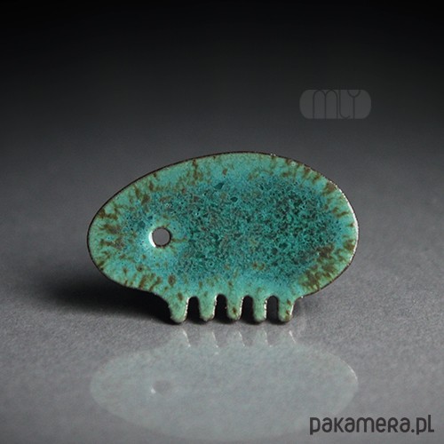 Oryginalna ceramiczna broszka inspirowana motywami biologicznymi, wykonana z gliny kamionkowej, szkliwiona zielonym szkliwem, zapięcie w kolorze starego złota. Długość ok. 3,7cm. Polecam