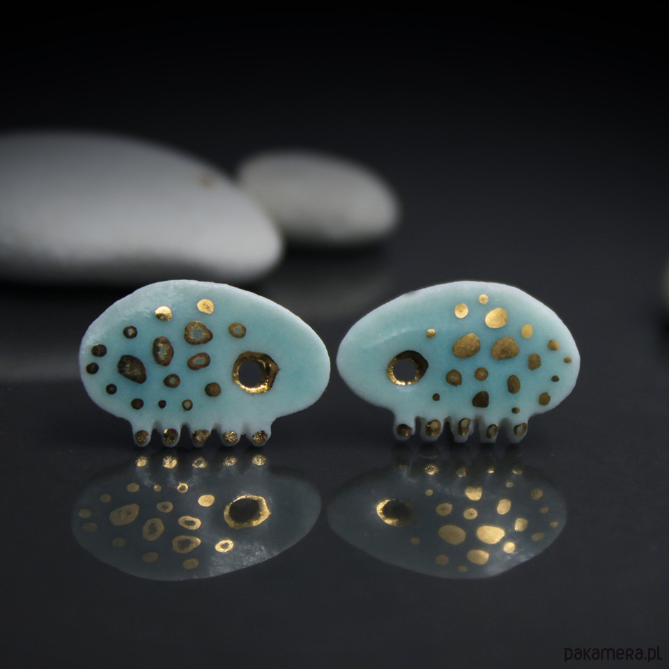 Efektowne kolczyki w formie sztyftów, ręcznie wykonane z delikatnej porcelany, jednostronnie szkliwione jasnozielonym szkliwem i dekorowane złotem naszkliwnym, na antyalergicznych sztyftach w kolorze srebrnym.długość elementu ceramicznego ok. 14mm, Polecam